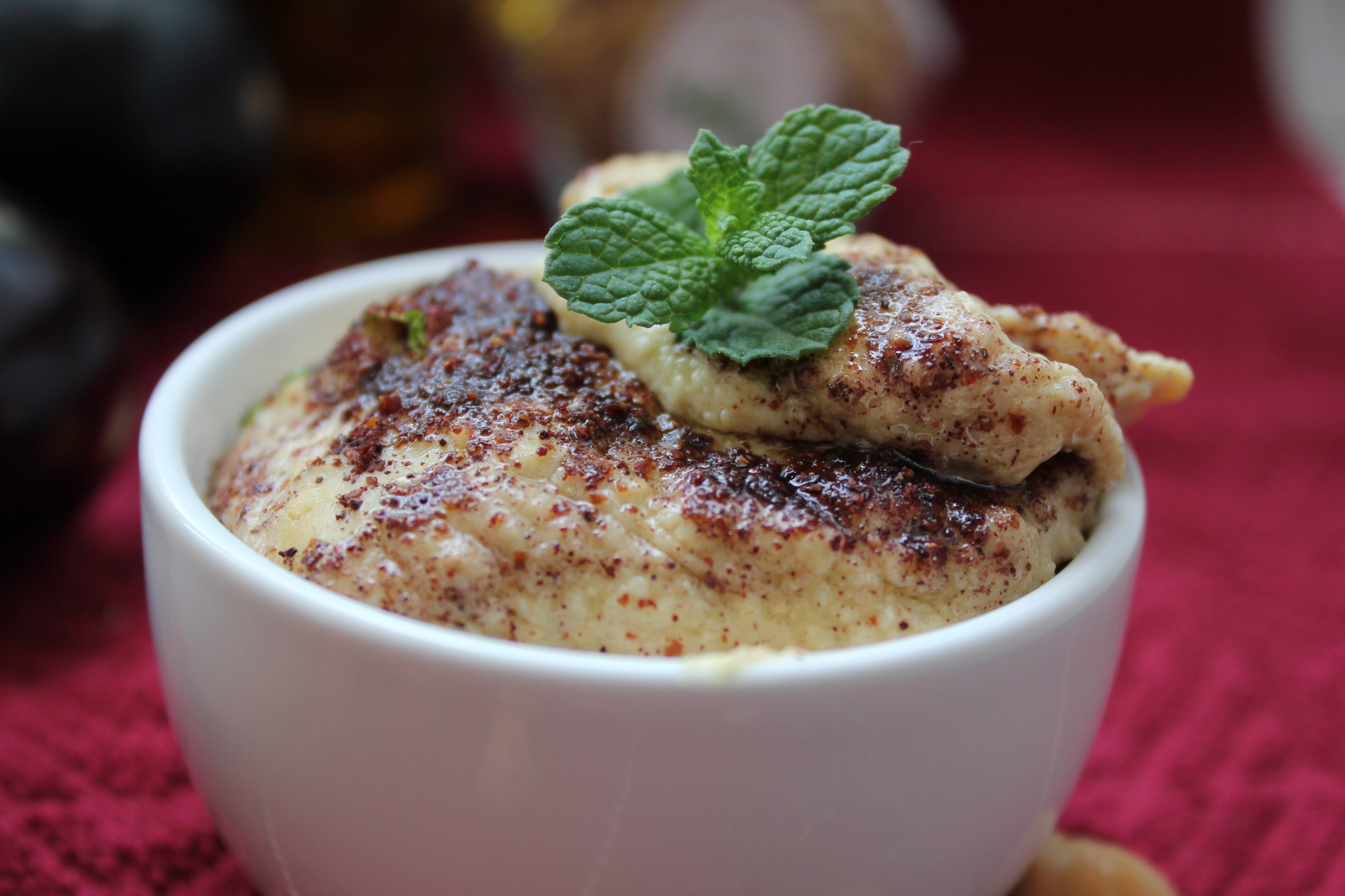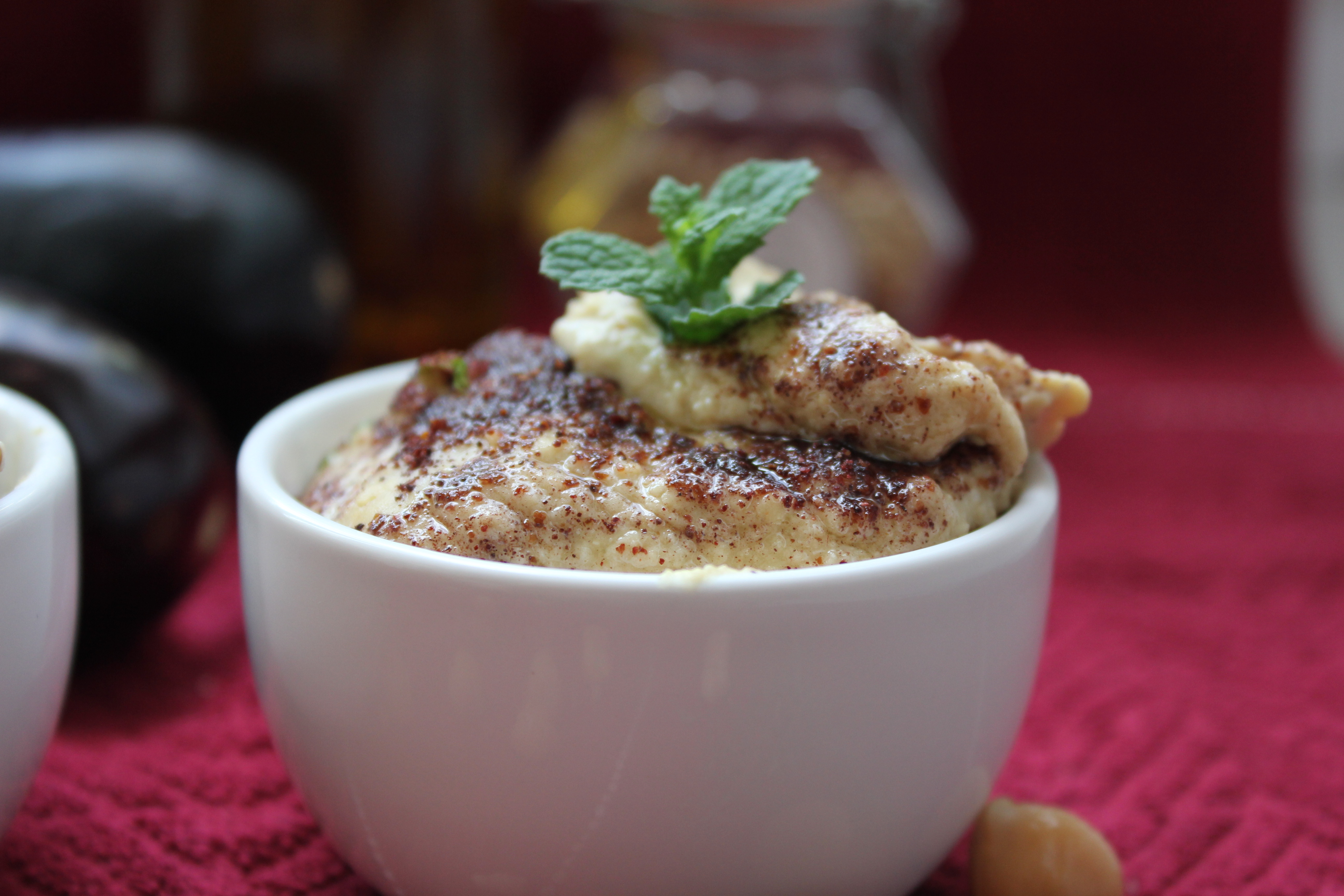 - Vendoseni salcën humus në tasin e servirjes dhe përsipër spërkateni me vaj, sumac (ose piperin e kuq) dhe pak majdanoz të grirë (mikserin nuk është nevoja ta lani pasi po këtu do bëjmë baba ganush-in)