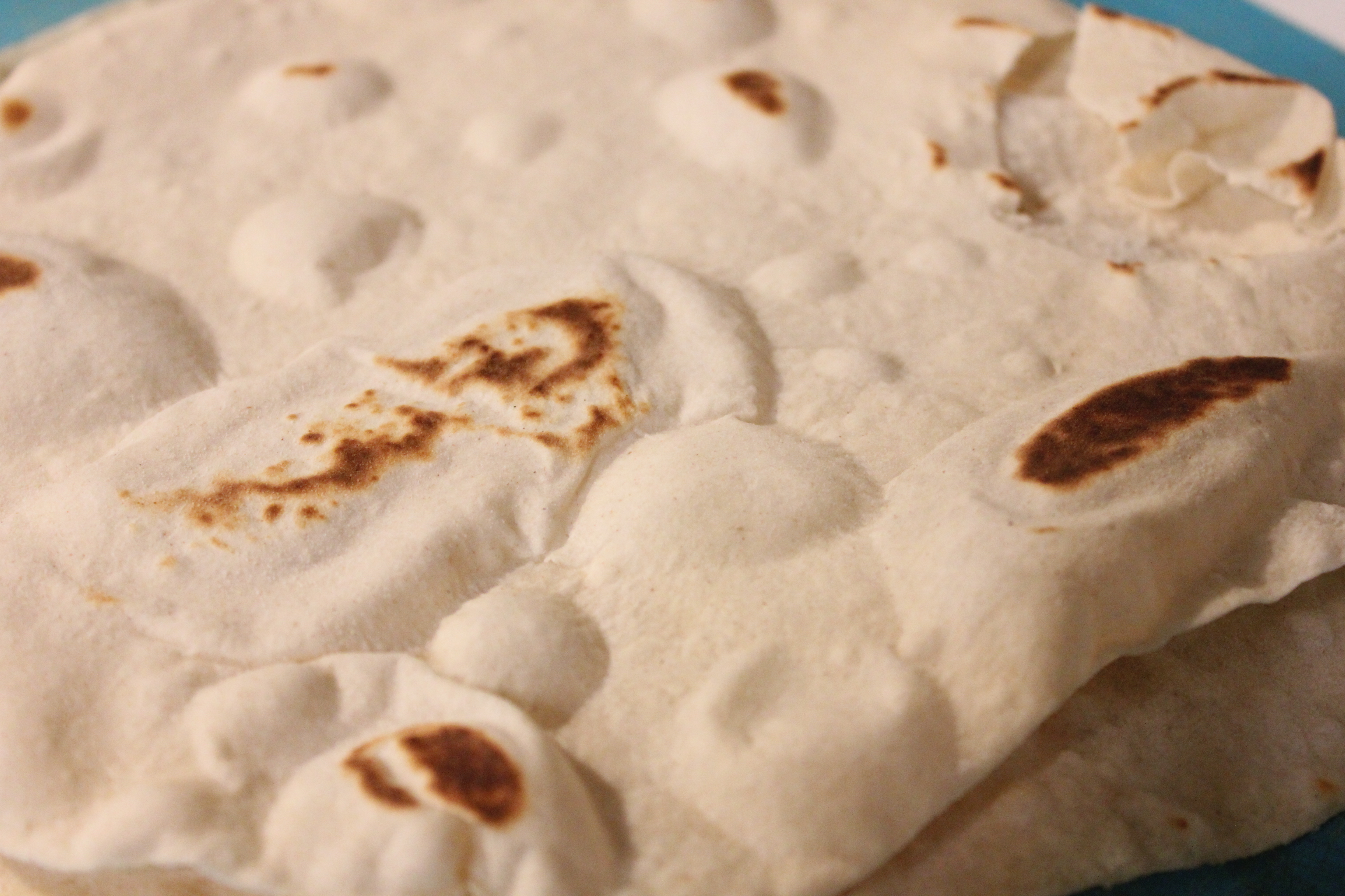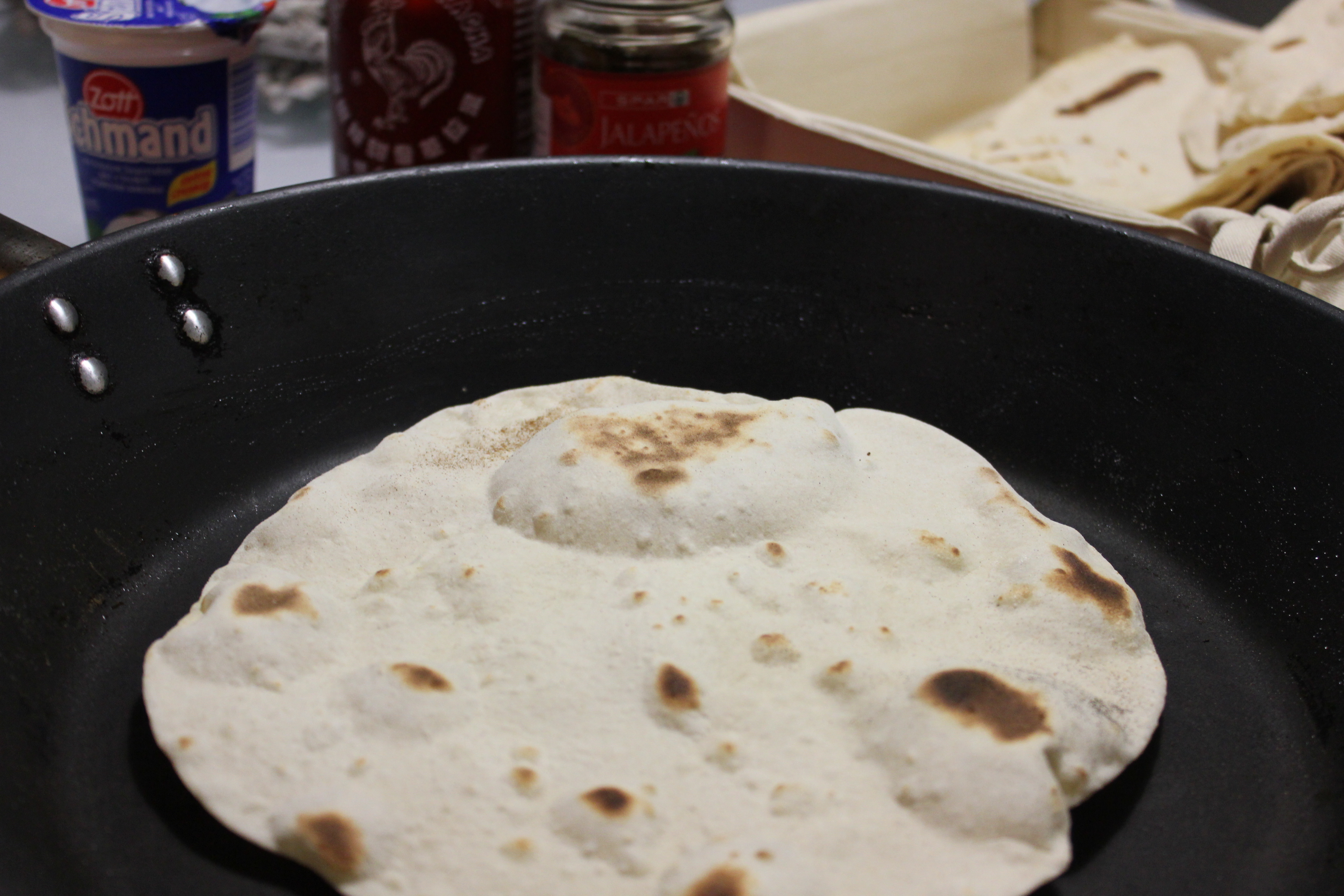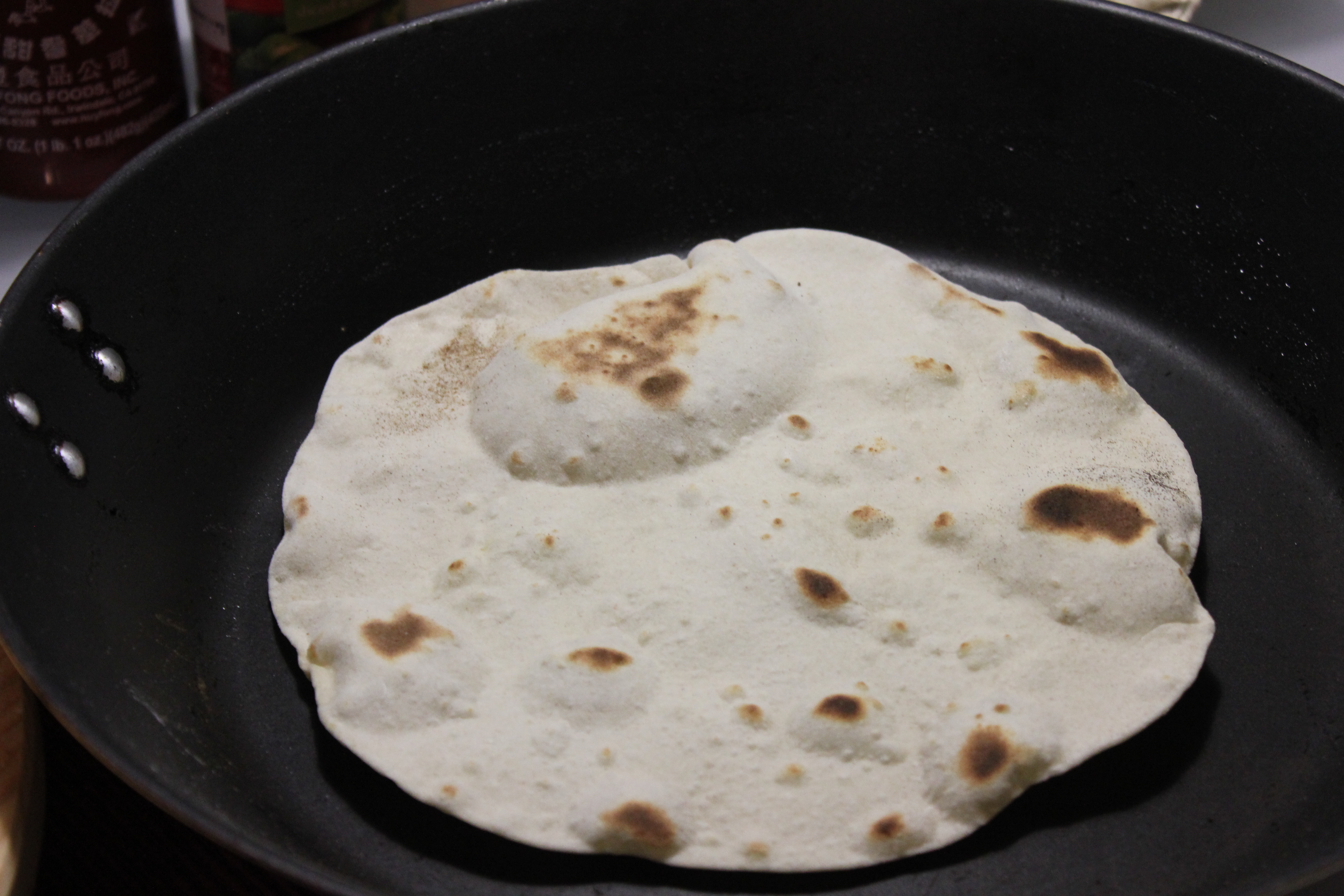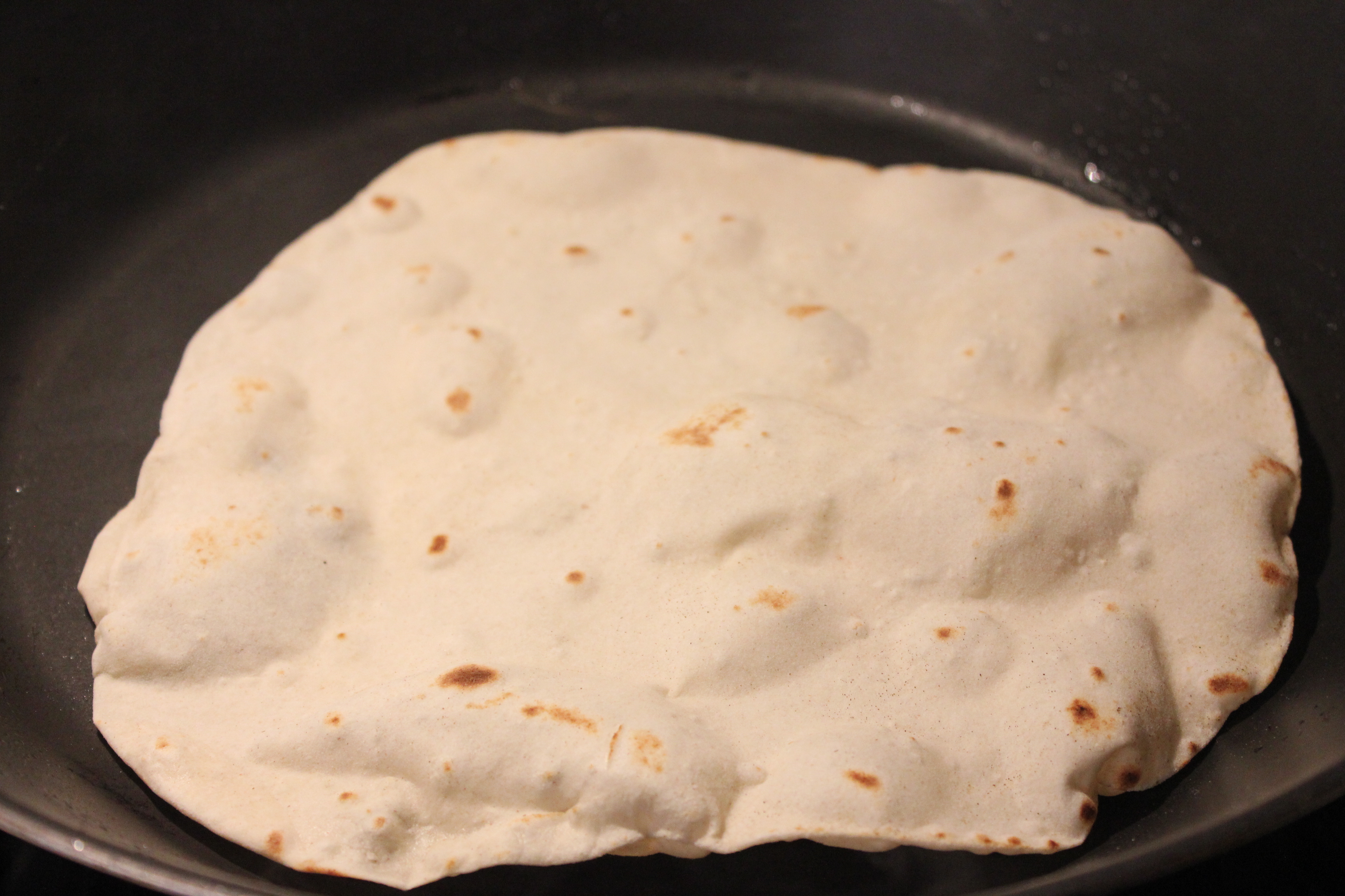 - Ngrohni në zjarr të mesatar një tigan që nuk ngjit dhe piqni njërën petë për gati 2 minuta. Do vëreni që vende vende do të keni xhepa të fryrë me ajër, kjo është një karakteristikë e piteve tortija. Kthejini nga ana tjetër dhe piqini eshe për 30 sekonda. Pitet janë pjekur kur të kenë vende-vende pikëza të vogla kafe. Kujdes të mos i piqni fort pasi në të kundërt pitet do bëhen kërce dhe do thyhen nëse i rrotulloni. Përsëritni këtë proçes me të gjitha petat e mbetura