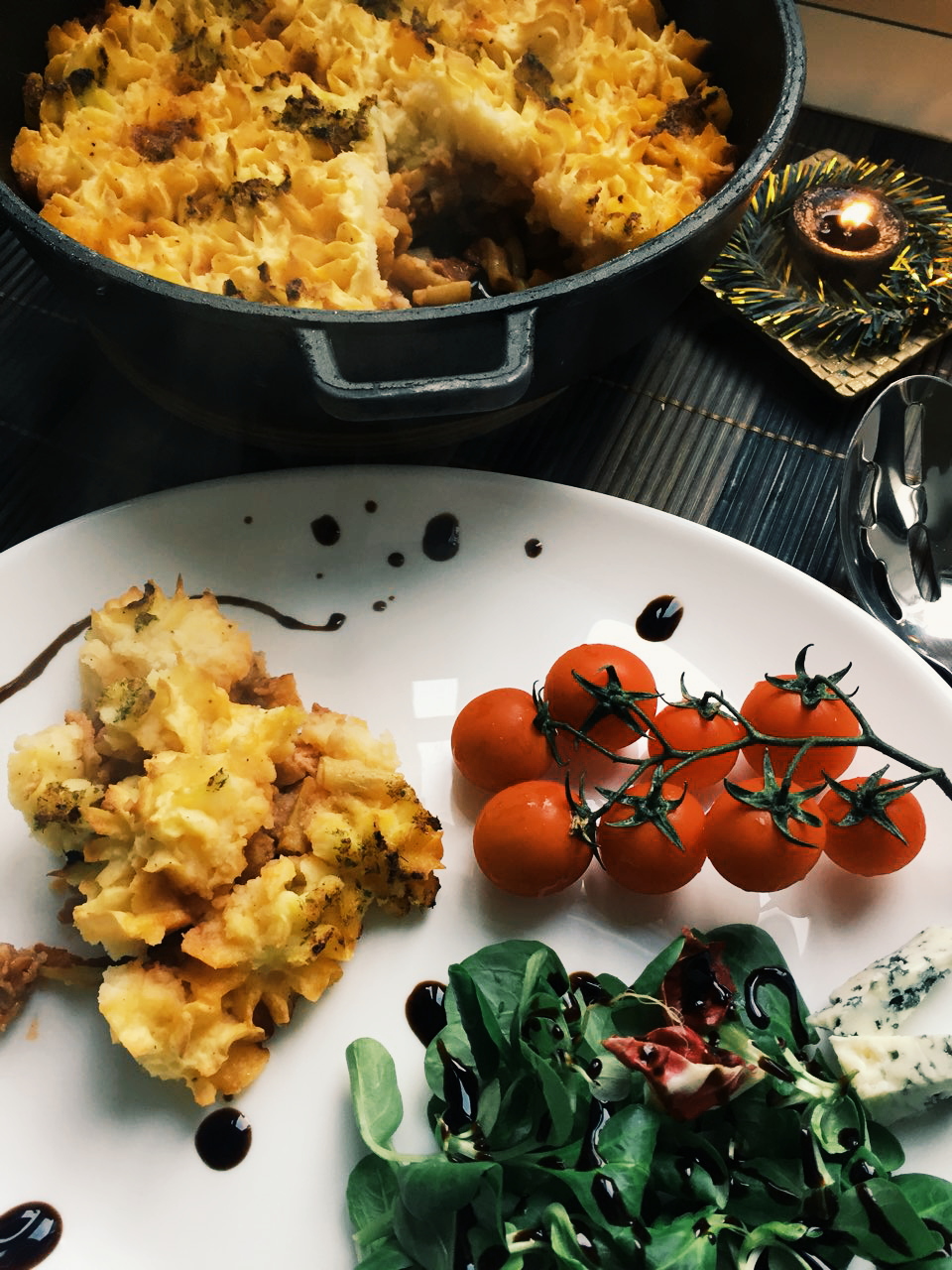 [lt_recipe name=”Tavë me mashurka, bizele dhe pure patatesh” servings=”4 persona” prep_time=”20M” cook_time=”30M” total_time=”50M” difficulty=”E thjeshtë” print=”yes” image=”https://bakemydayhappy.com/wp-content/uploads/2017/11/cottage-pie-4.jpg” ingredients=”• 2 patate të mëdha;• 2 kupa mashurka të prera në copa të vogla ;• 1 kupë bizele të ngrira;• 200gr salçiçe italiane me mish të grirë;• gjysëm kanaçe domate të plota;• 3 lugë gjelle vaj ulliri;• 2 thelpinj hudhre të grira;• 1/2 kupë djathë pice i grirë;• disa gjethe borzilok i freskët” ]Qëroni dhe prisni patatet në kuba. Ziejini në ujë me pak kripë deri sa të zbuten mirë;Ngrohni furrën në 220 °C;Në një tigan të thellë dhe që mund të përdoret në furrë ngrohni pak vaj ulliri dhe hidhni në të hudhrën e shtypur. Lereni të gatuhet sa të lëshojë aromën, por kujdes mos e digjni;Shtoni salçiçen të cilës ia keni hequr lëkurën dhe copëtojeni trashë me lugë druri. Fërgojeni për disa minuta sa të marrë ngjyrë kafe të lehtë. Shtoni mashurkat, domatet e kanaçes të cilat shtrydhini me duar dhe lerini në zjarr për gati 3 minuta;Rregulloni shijen me kripë nëse është e nevojshme dhe shtoni bizelet e ngrira. Fikni zjarrin dhe merruni me patatet tashmë të ziera dhe kulluara nga uji;Shtypni mirë patatet. Mbushni një qese pastiçerie me formë ose thjesht përdorni një lugë për te sistemuar purenë mbi tiganin ku është mbushja;Shtypni gjethet e borzilokut në havanë me pak vaj ulliri dhe sperkateni mbi purenë e patates; Hidhni djathin e picës përsipër dhe piqeni në tavën e parangrohur për gati 30 minuta ose sa të marrë ngjyrë kafe të lehtë; Servireni ende të ngrohtë duke e shoqëruar me një miks sallate jeshile[/lt_recipe]