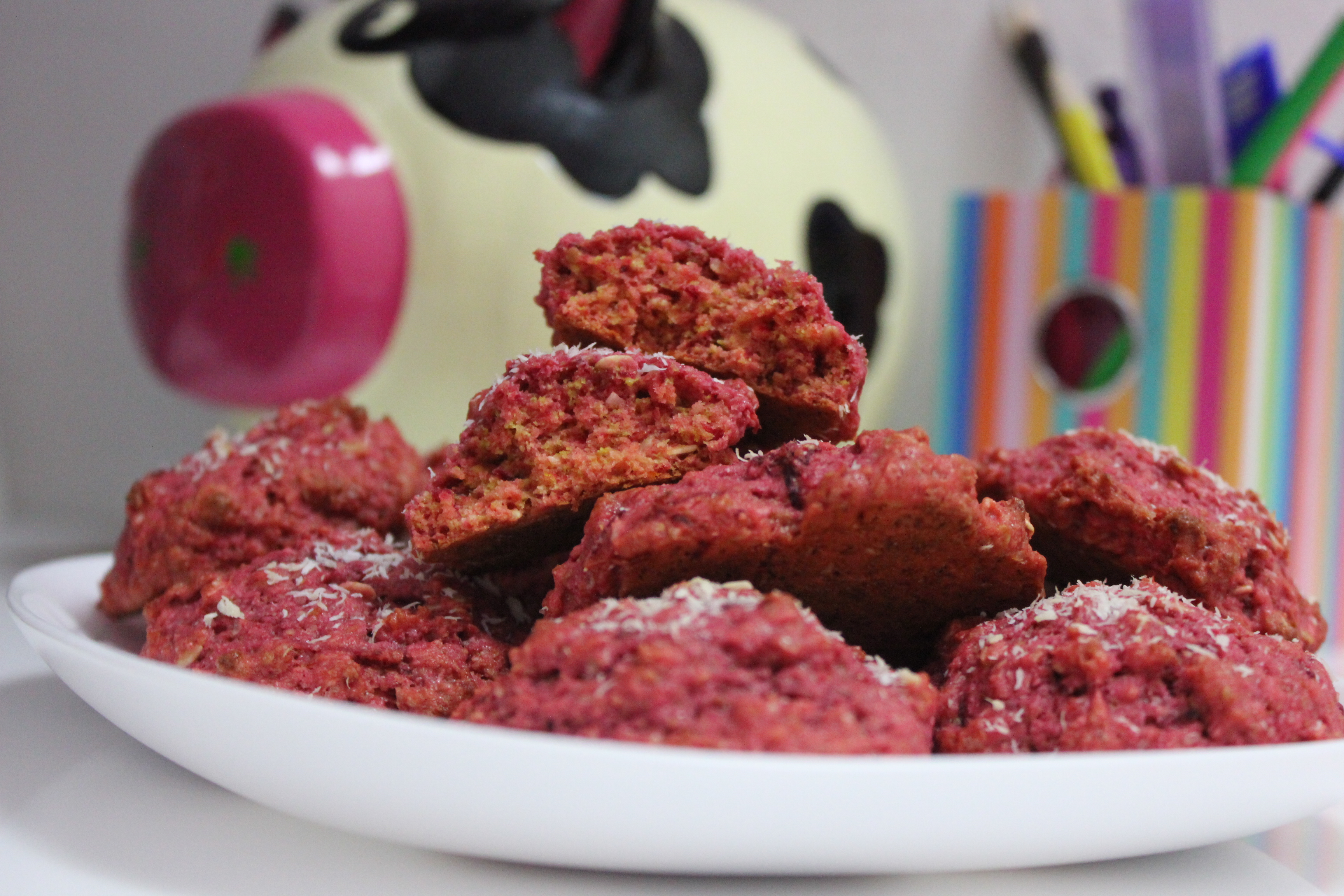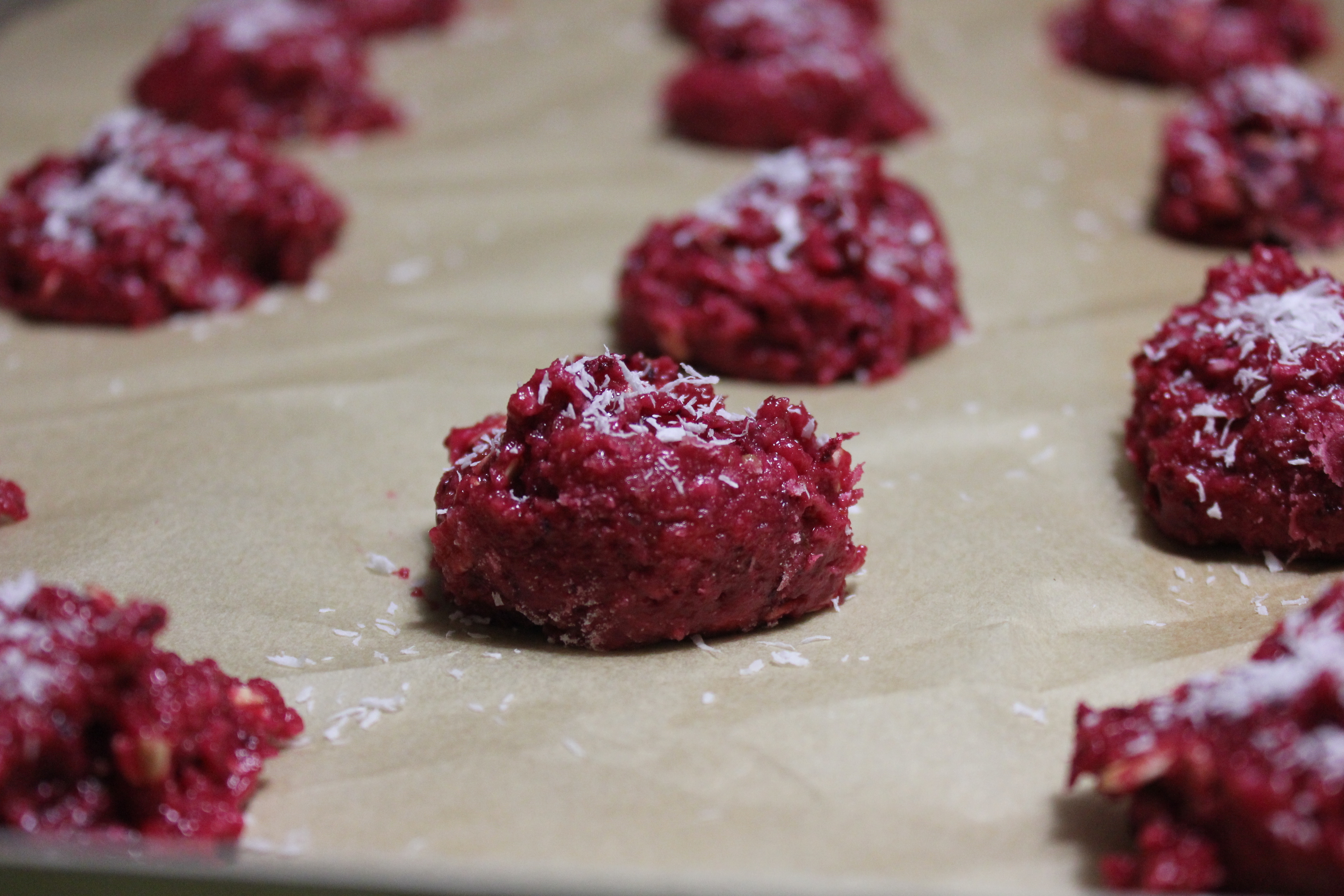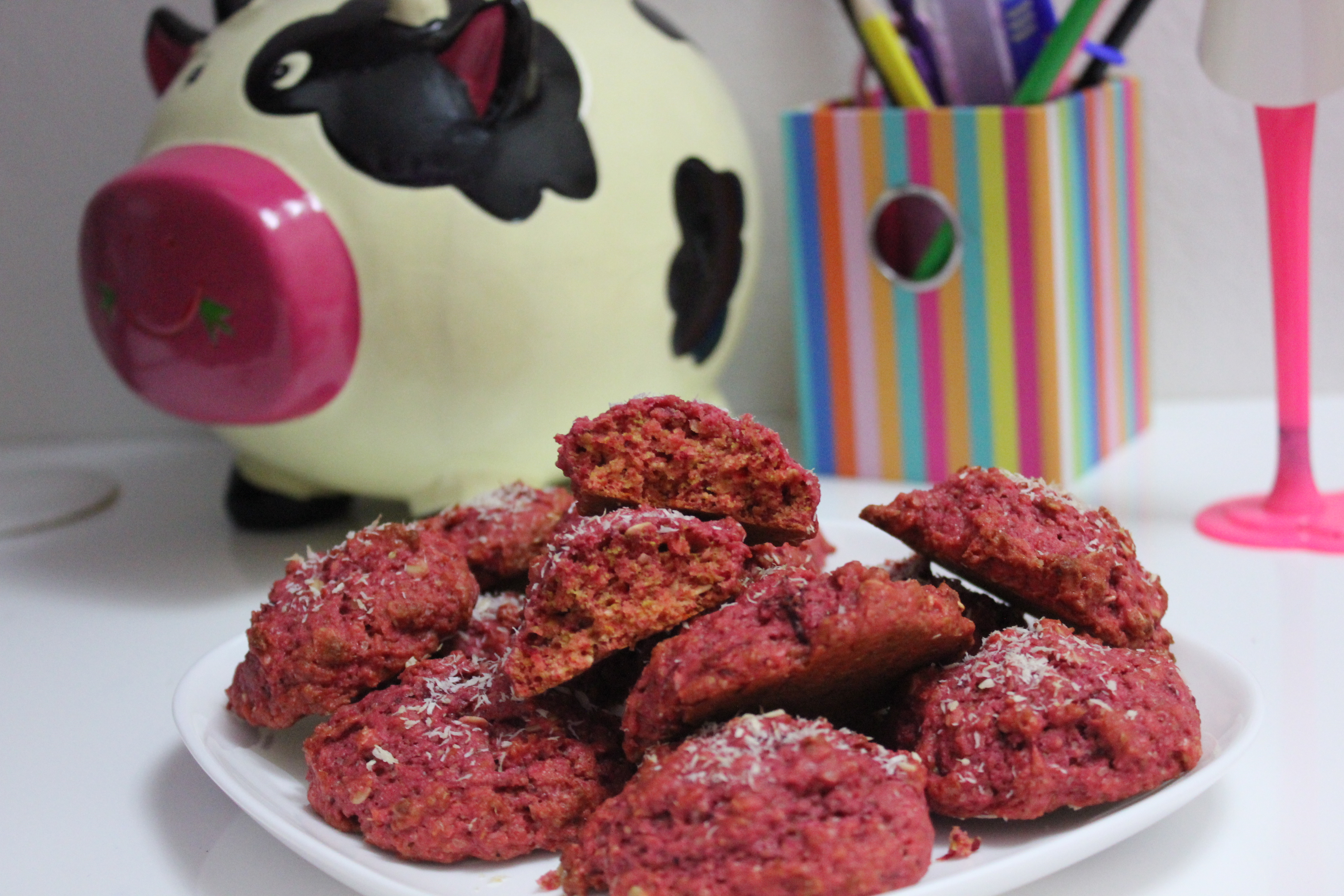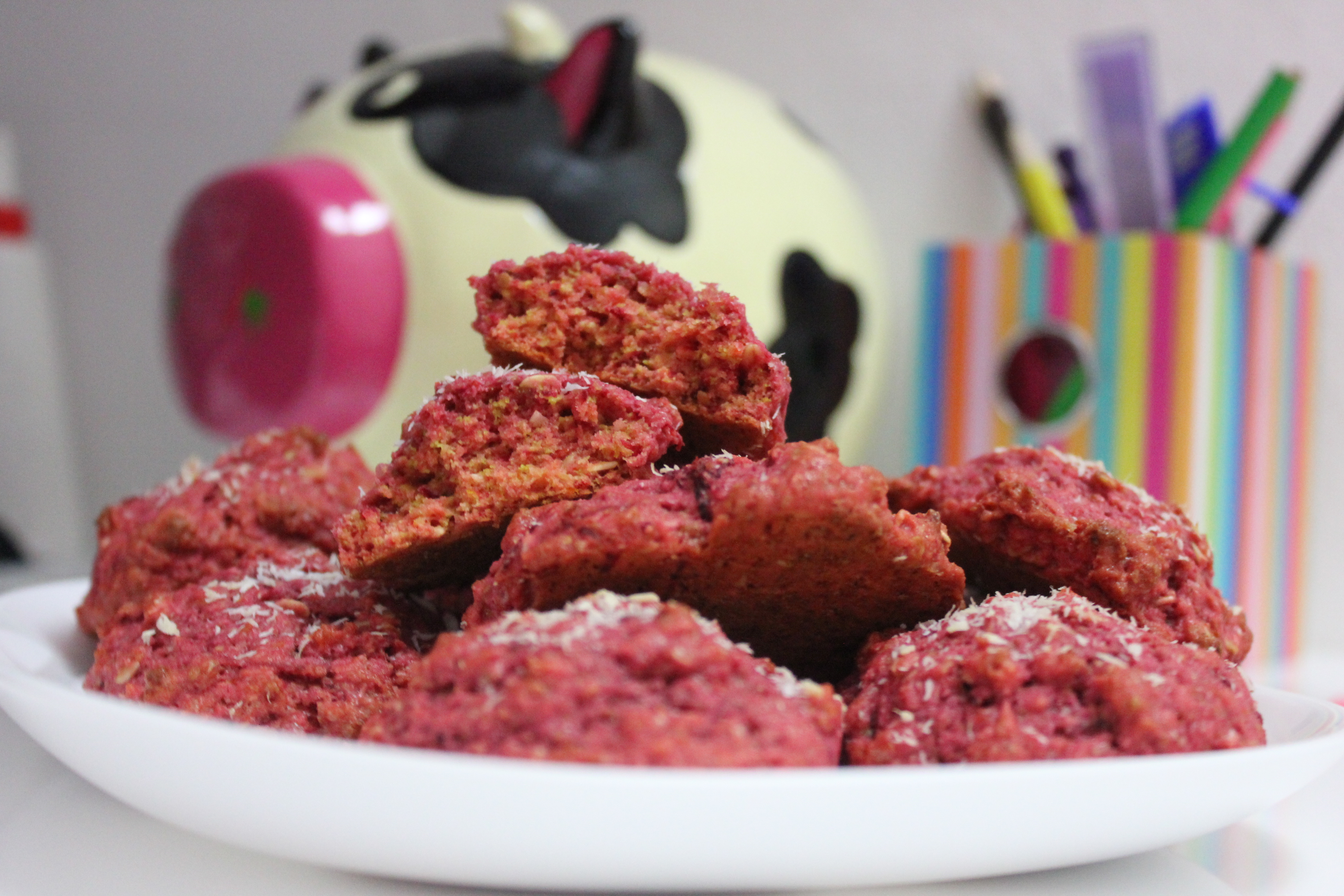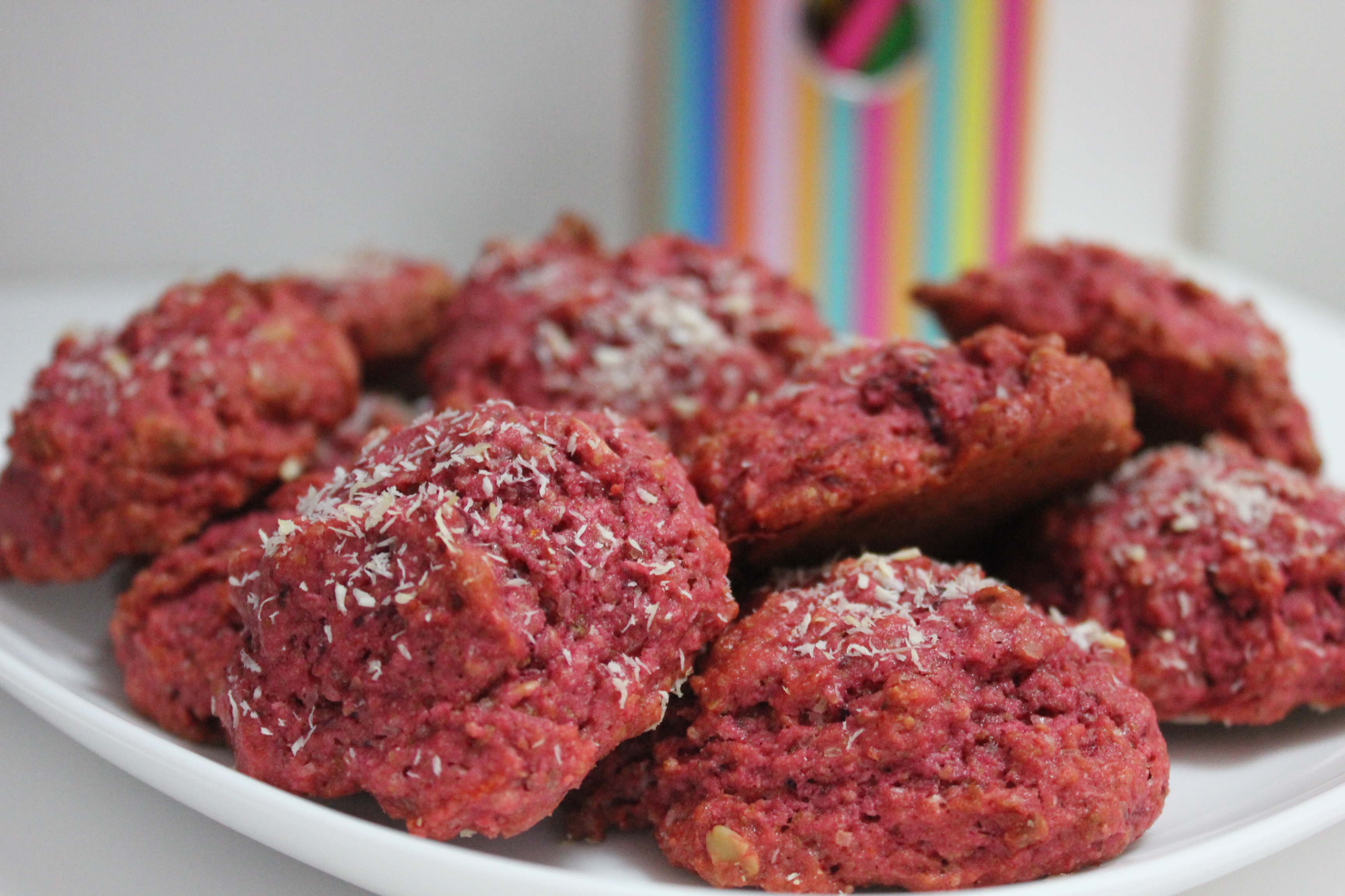 [lt_recipe name=”Vegan red beet cookies” servings=”20 cookies” prep_time=”5M” cook_time=”30M” total_time=”35M” difficulty=”Easy” print=”yes” image=”https://bakemydayhappy.com/wp-content/uploads/2018/02/beet-cookies12.jpg” ingredients=”• ¾ cup coconut oil;• juice and zest of 1 orange;• 2/3 cup brown sugar;• 1 small beet, finely grated;• 3 tsp. desiccated coconut;• 5 tsp. wheat germ;• 3 tsp. rolled oats;• 1 2/3 cup flour;• ½ tsp. baking soda;• ½ tsp. salt” ]Preheat the oven to 180˚ C; In a large mixing bowl, stir together coconut oil, beet, orange juice and zest, and sugar until combined;Add the dry ingredients and stir well; Using a small ice-cream scoop or a teaspoon drop the cookies in a baking tray fitted with parchment paper; Sprinkle some desiccated coconut on top and bake for about 20-25 minutes;Repeat with the remaining dough; Store the cookies in an airtight container for about two weeks[/lt_recipe]