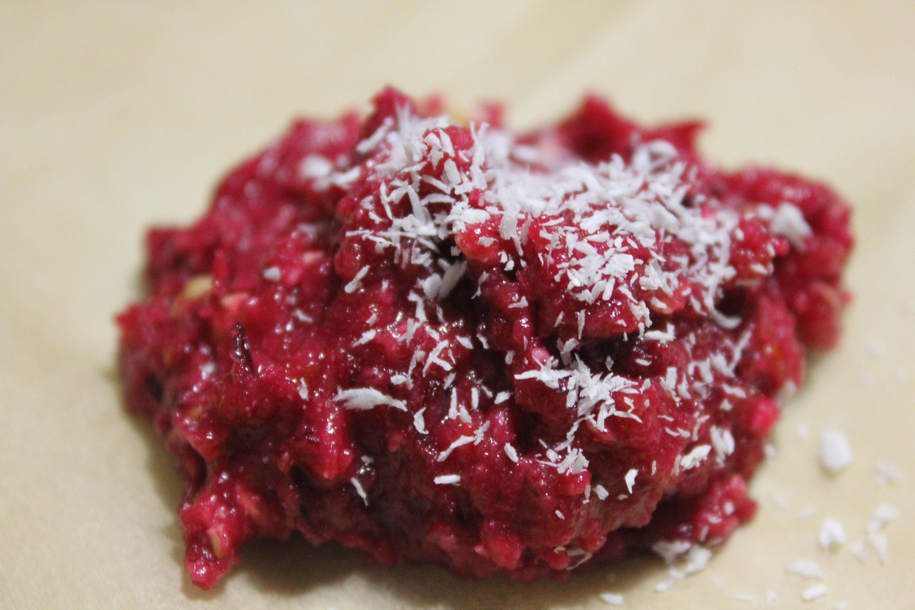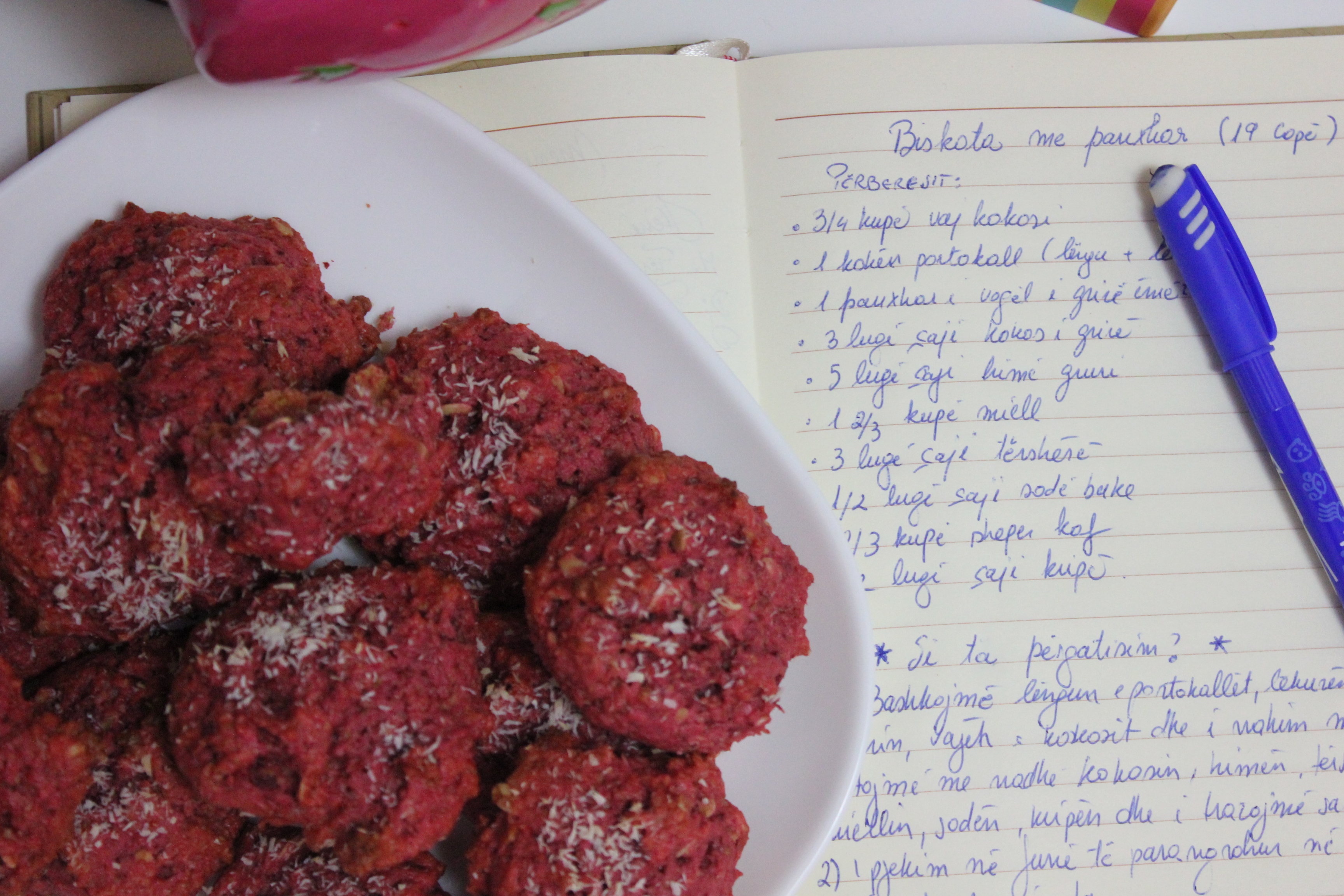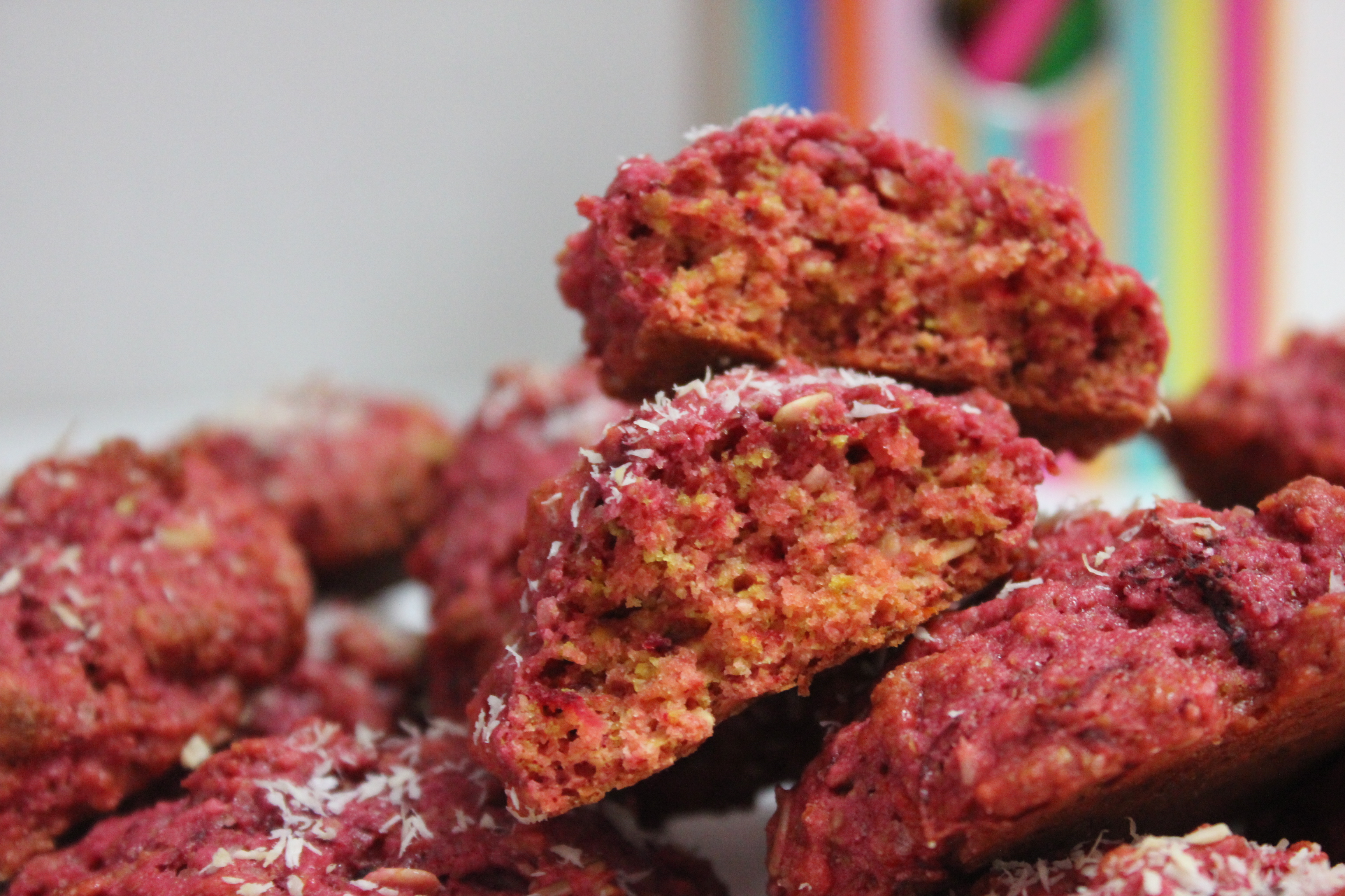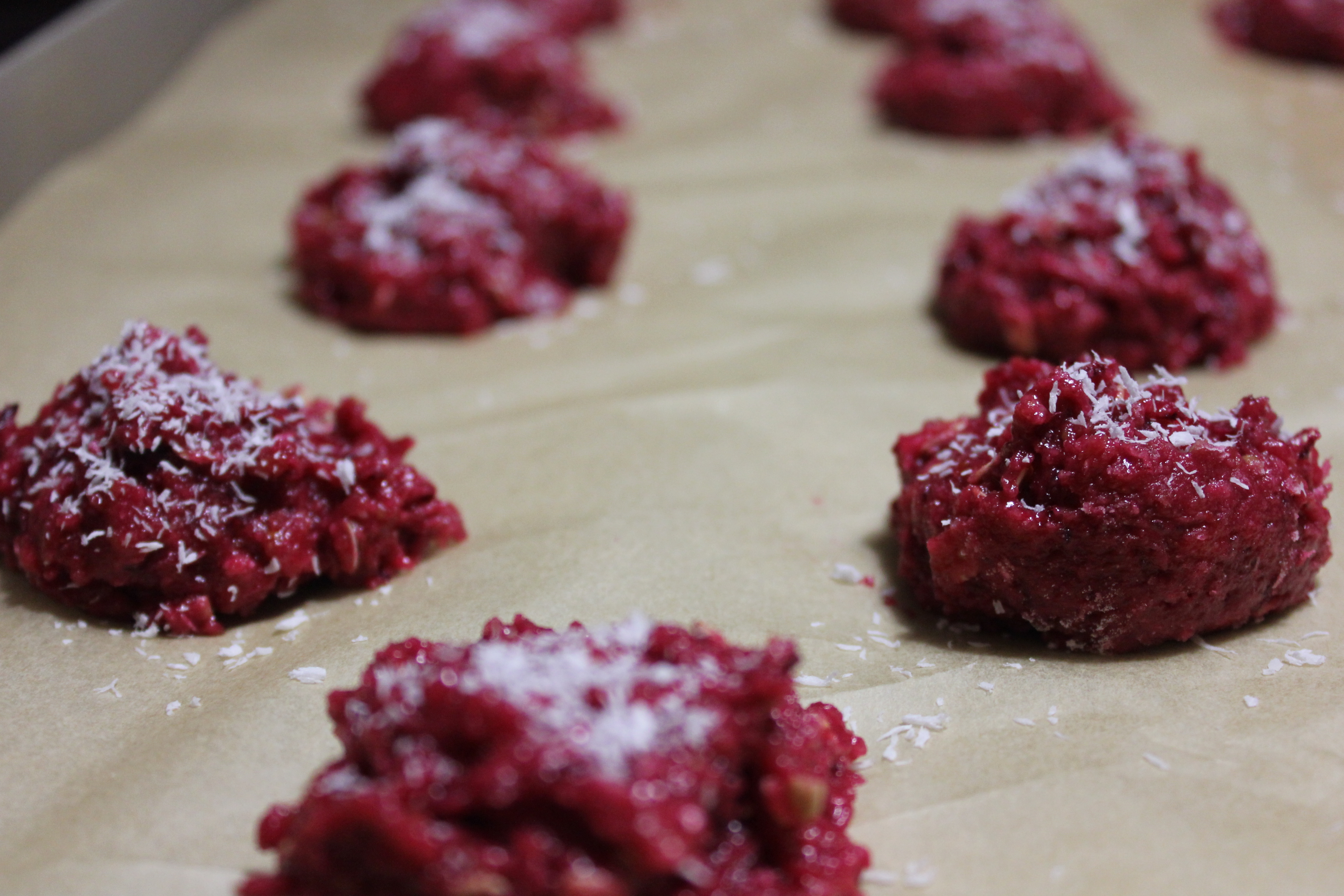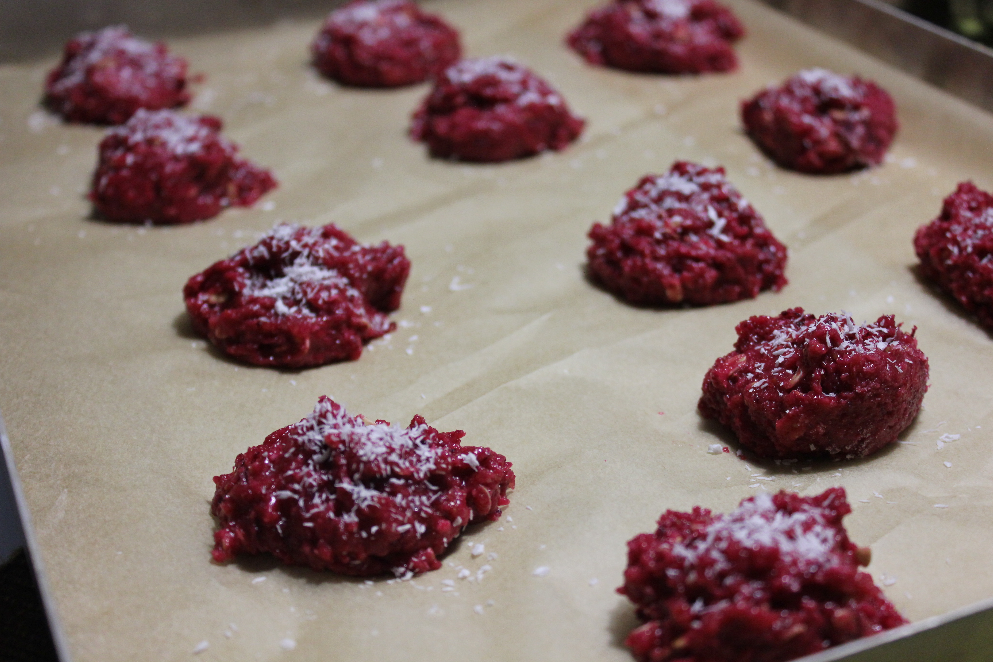 [lt_recipe name=”Vegan red beet cookies” servings=”20 cookies” prep_time=”5M” cook_time=”30M” total_time=”35M” difficulty=”Easy” print=”yes” image=”https://bakemydayhappy.com/wp-content/uploads/2018/02/beet-cookies12.jpg” ingredients=”• ¾ cup coconut oil;• juice and zest of 1 orange;• 2/3 cup brown sugar;• 1 small beet, finely grated;• 3 tsp. desiccated coconut;• 5 tsp. wheat germ;• 3 tsp. rolled oats;• 1 2/3 cup flour;• ½ tsp. baking soda;• ½ tsp. salt” ]Preheat the oven to 180˚ C; In a large mixing bowl, stir together coconut oil, beet, orange juice and zest, and sugar until combined;Add the dry ingredients and stir well; Using a small ice-cream scoop or a teaspoon drop the cookies in a baking tray fitted with parchment paper; Sprinkle some desiccated coconut on top and bake for about 20-25 minutes;Repeat with the remaining dough; Store the cookies in an airtight container for about two weeks[/lt_recipe]