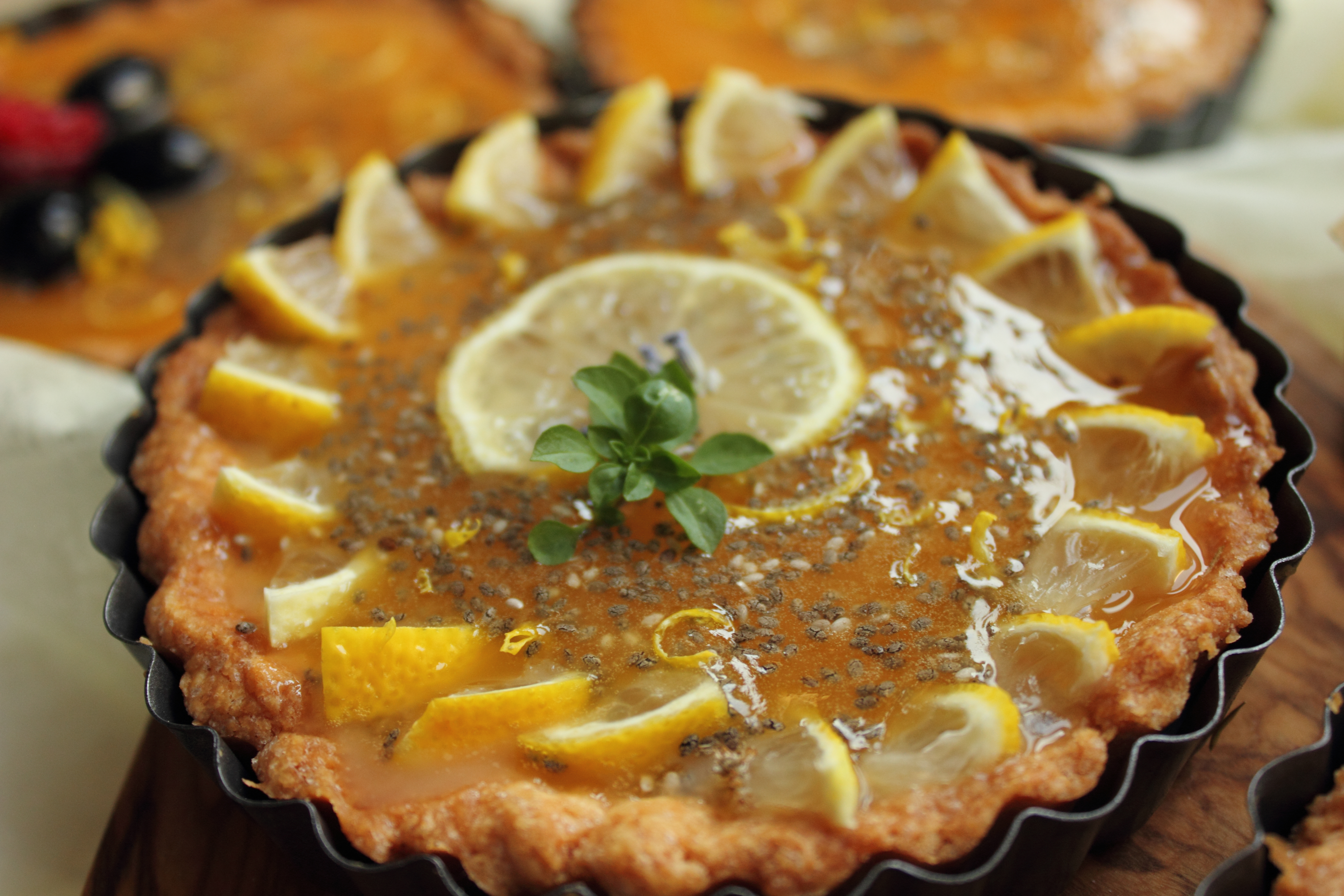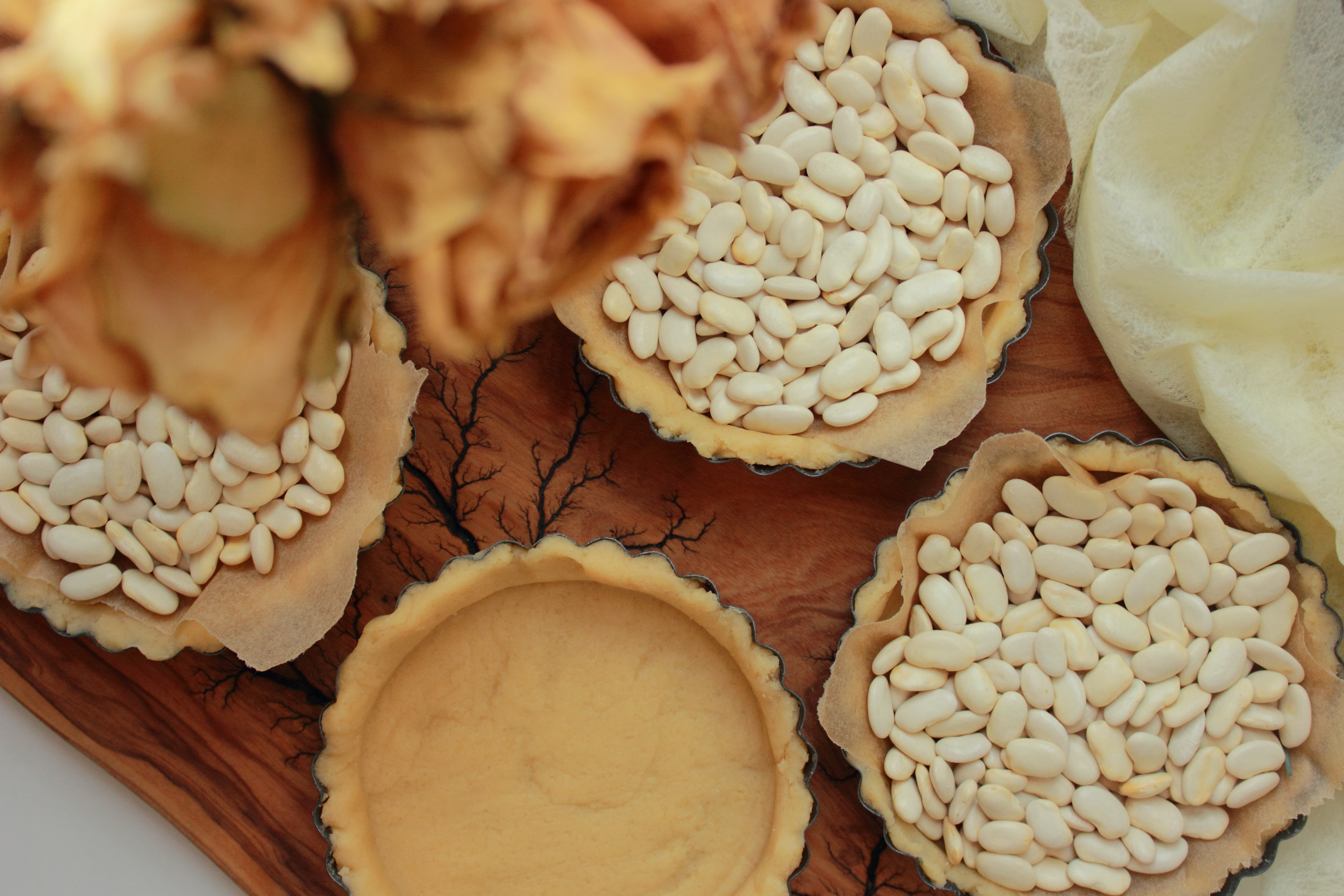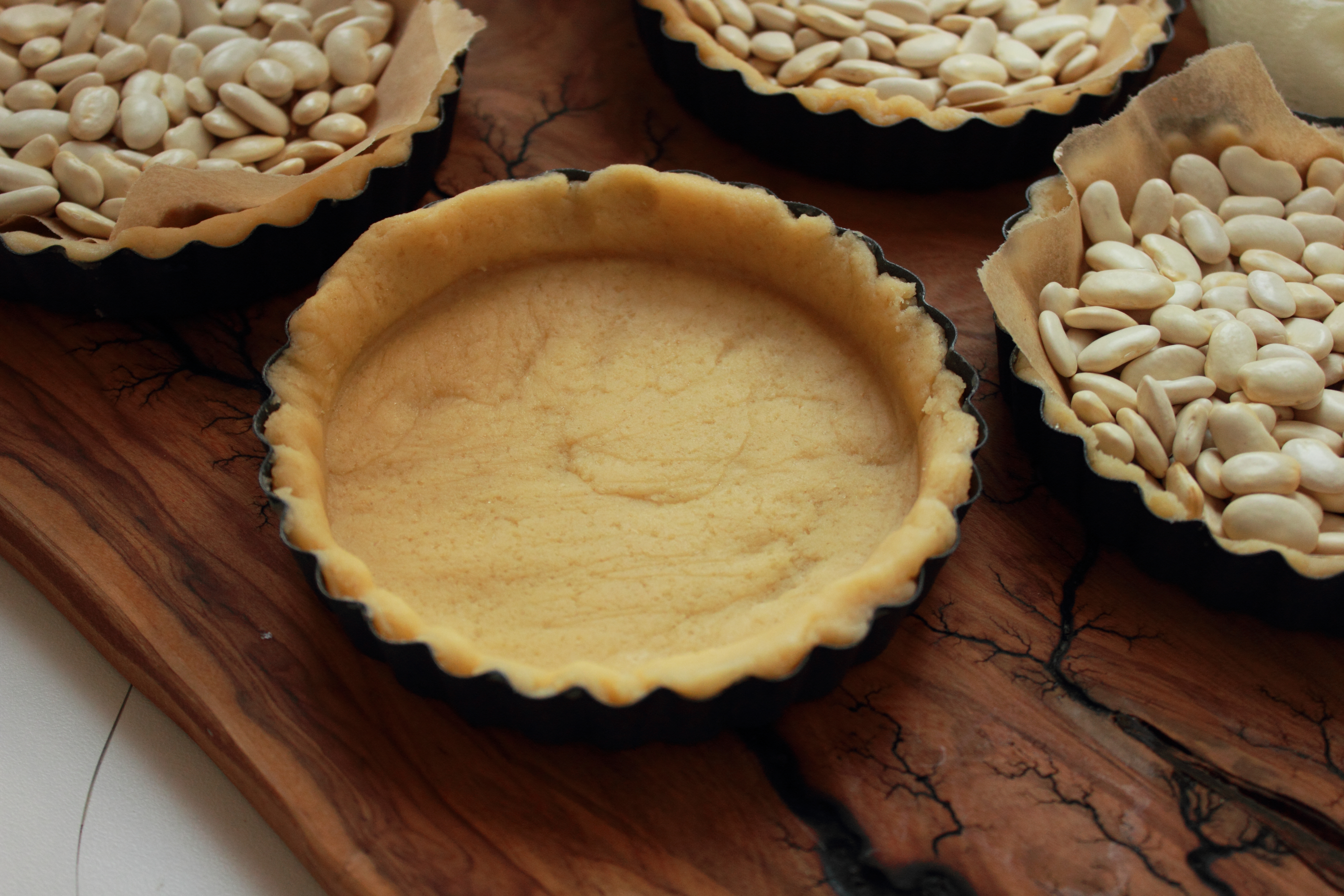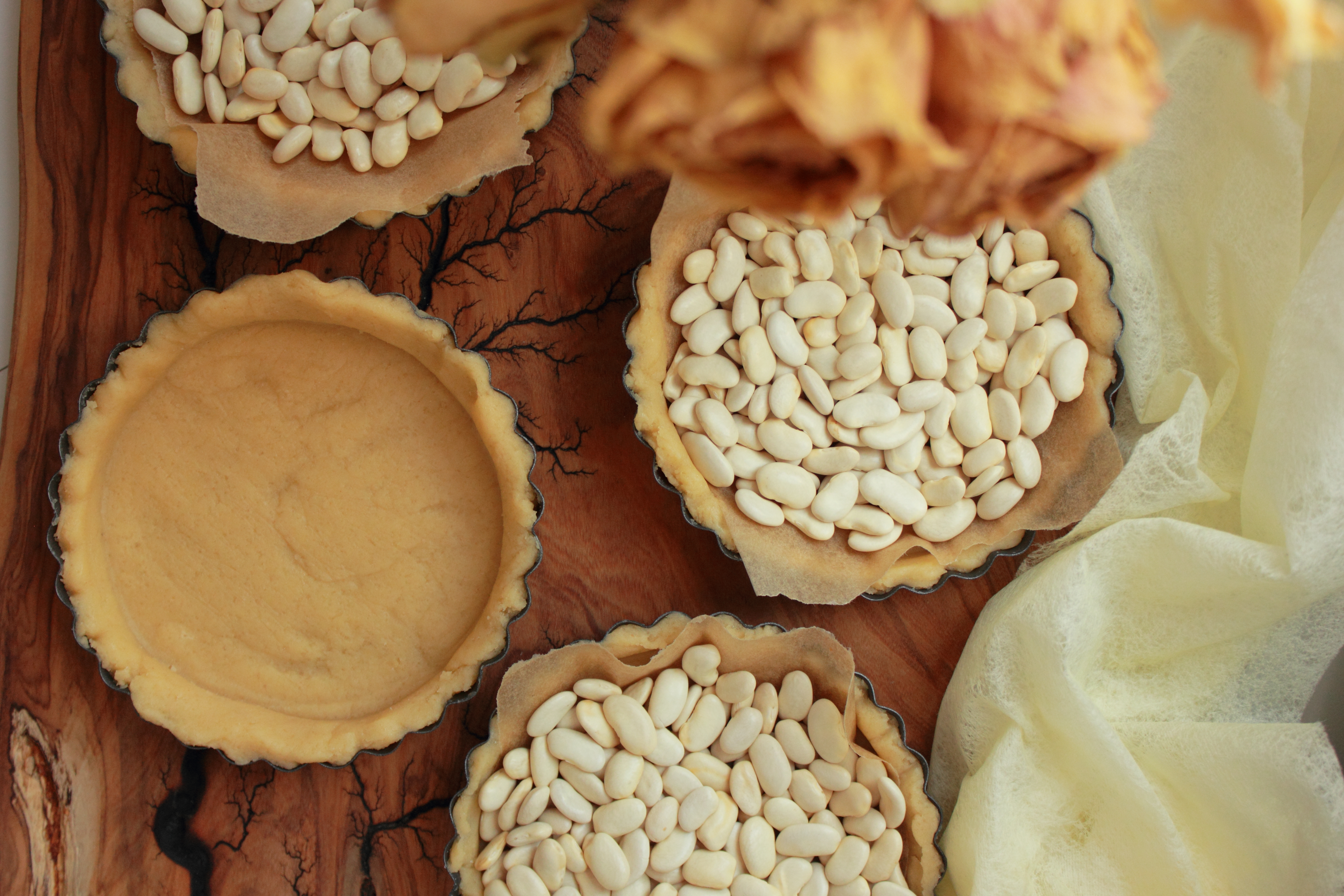 [lt_recipe name=”Tarta me limon dhe fara çia” servings=”4 tarta të vogla” prep_time=”40M” cook_time=”40M” total_time=”1H20M” difficulty=”Mesatare” print=”yes” image=”https://bakemydayhappy.com/wp-content/uploads/2018/09/tarta-me-limon-7.jpg” ingredients=”Për brumin:;• 180gr miell;• 60gr sheqer;• 120gr gjalpë i ftohtë;• 1 kokërr vezë;• 1 lugë çaji kripë;Për kremin e limonit:;• 2 të verdha vezësh;• ¼ kupë lëng limoni (gati 2 kokrra limon);• 1 ½ kupë sheqer;• 80gr gjalpë i ftohtë;• 2 lugë gjelle fara çia;” ]Fillimisht përgatisim brumin e tartës (i cili mund të përgatitet edhe disa ditë më parë por me kusht që të ruhet në frigorifer); Fusim në mikser miellin, kripën, sheqerin dhe ndezim mikserin për disa sekonda; Shtojmë gjalpin e ftohtë të prerë në kuba dhe vezën, e më pas ndezim mikserin për disa sekonda deri sa brumi të lidhet disi bashkë por jo të bëhet topth i fortë; E heqim nga mikseri dhe e vendosim në një qese transparente, i japim formë disku me duar dhe e vendosim ne frigorifer per 30 minuta; Ndërkohë vijojmë me kremin e limonit. Në një tenxhere të vogël hedhim gjithë përbërësit e mbushjes (përveç gjalpit dhe farave çia). E vendosim enën në banjomari dhe e gatuajmë deri sa salca të trashet. Pasi masa të jetë trashur, e heqim nga zjarri dhe shtojmë gjalpin. E trazojmë mirë deri sa i tërë gjalpi të jetë bashkuar mirë me masën. Unë do këshilloja ta përgatisnit salcën 1 ditë para dhe ta ruanit në frigorifer dhe në një enë të mbyllur fort; Pasi kremin ta kemi gati, heqim brumin nga frigoriferi e me pas nga mbështjellësja dhe e hapim me okllai; Ngrohim furrën në 220 ºC. Presim brumin në forma rrethore sa diametri i tavave të vogla të tartave dhe më pas i shtrojmë petat e brumit në secilën tavë. Sipër tyre, shtrojmë pak letër pjekjeje dhe i hedhim brenda fasule (nga ato të vjetrat që mezi zihen ☺) si në foto; I pjekim tavat në furrën e parangrohur per gati 20 minuta, më pas heqim fasulet dhe letrat e pjekjes dhe i pjekim tartat edhe per 20 minuta të tjera ose deri sa të marrin një ngjyrë kafe të lehtë; Pasi t’i kemi pjekur i heqim nga furra dhe i lëmë të ftohen mirë; Për t’i përfunduar, mbushim secilën tartë me kremin e limonit, spërkasim mbi secilën disa fara çia dhe i dekorojmë sipas dëshirës me fruta të tjera.[/lt_recipe]