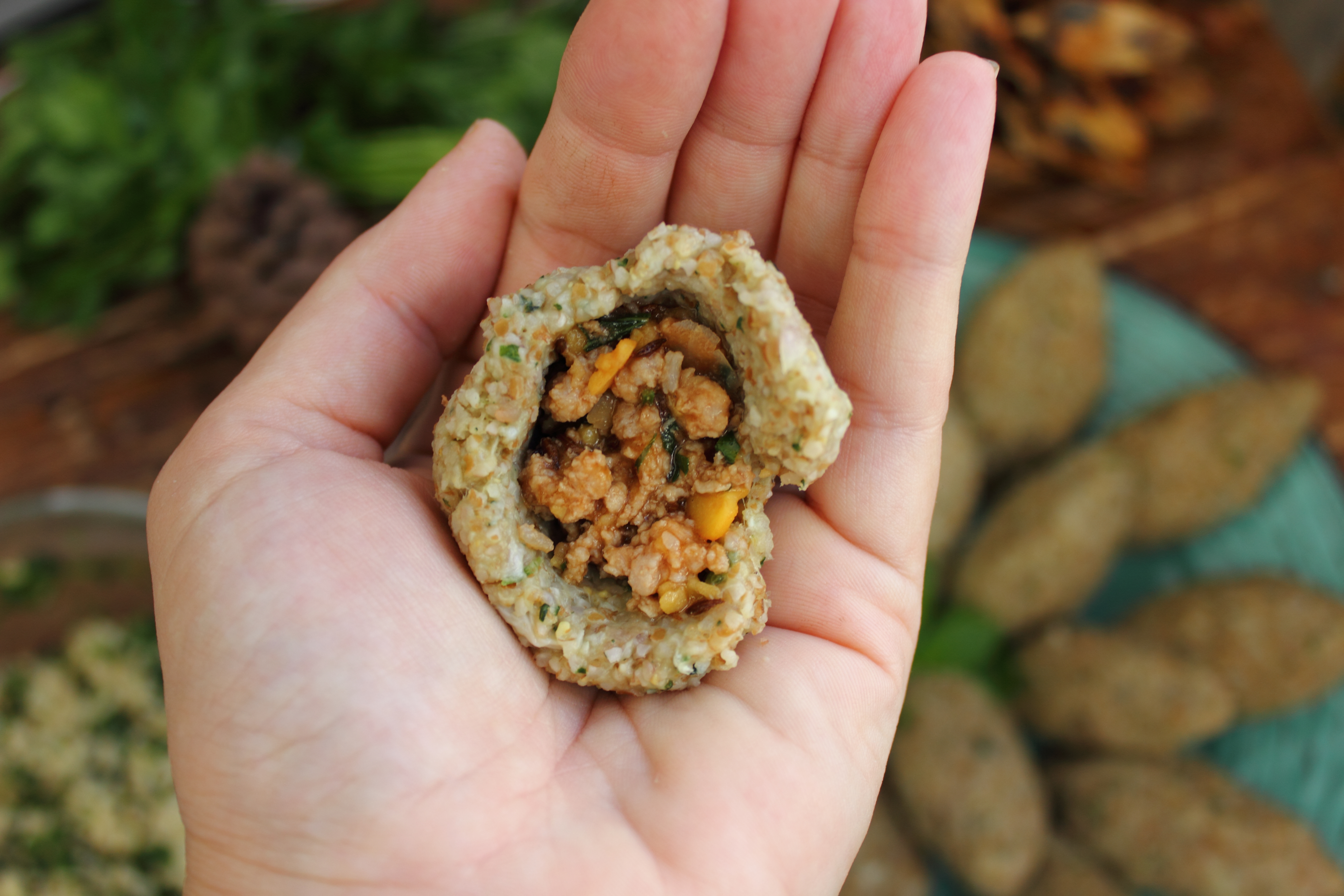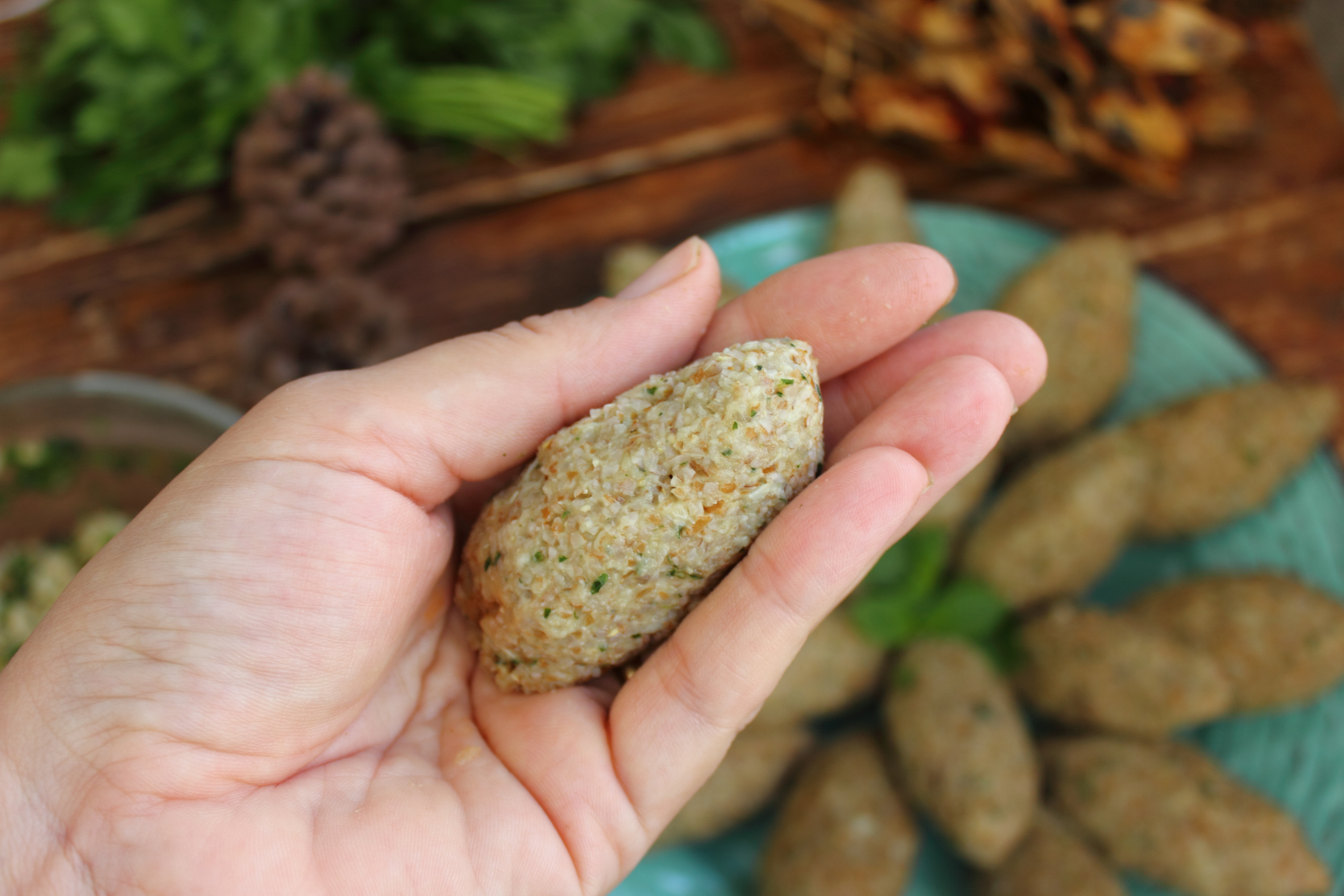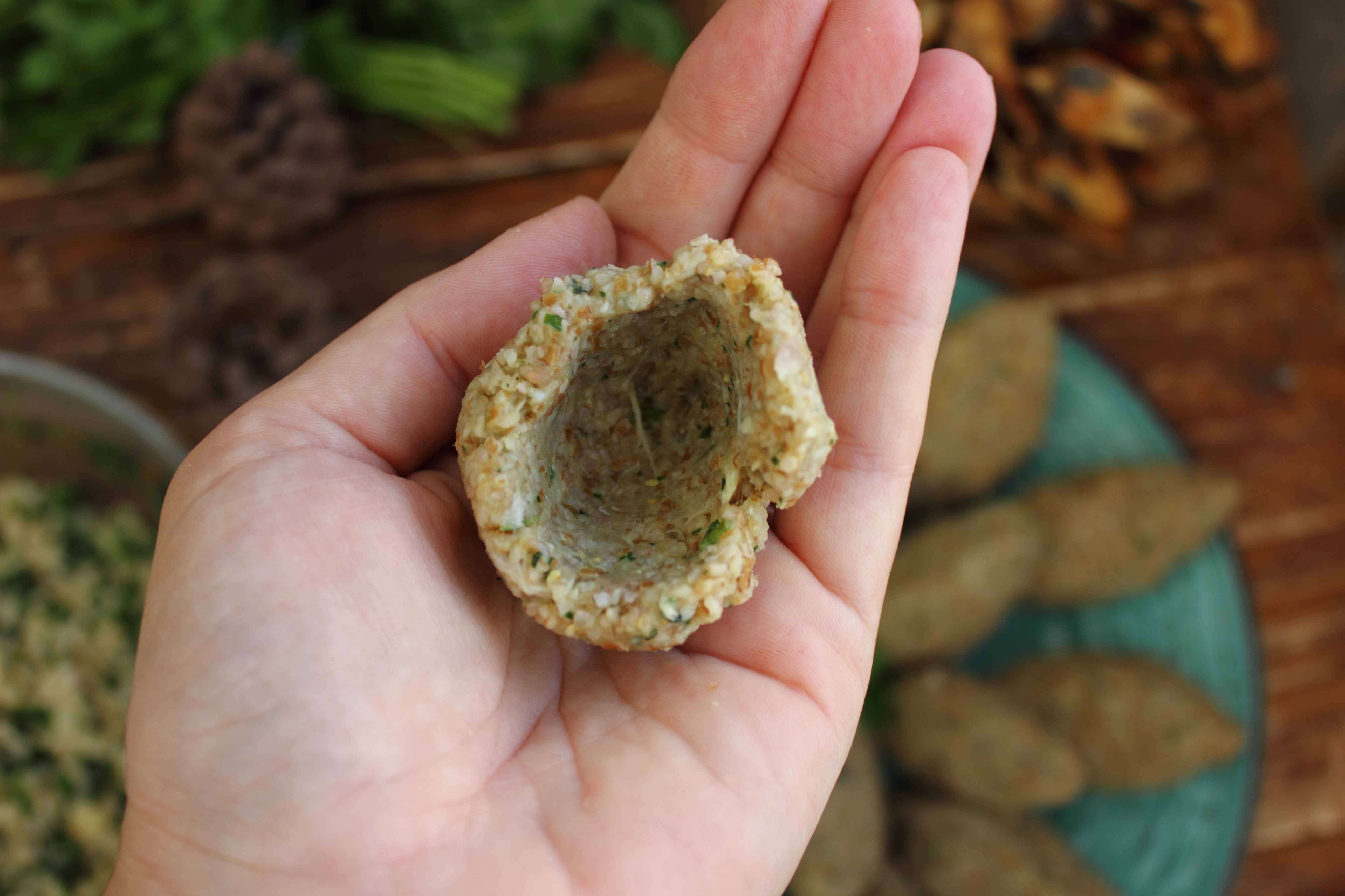 [lt_recipe name=”Qofte kibbeh dhe gatime të tjera Lebaneze” servings=”4 persona” prep_time=”30M” cook_time=”20M” total_time=”45M” difficulty=”Mesatare” print=”yes” image=”https://bakemydayhappy.com/wp-content/uploads/2018/10/fried-kibbeh.jpg” ingredients=”Për Pitet:;• 3 pite tortilla (ose pite arabe);• 1 lugë çaji Za’atar;• 1 lugë gjelle vaj ulliri;Për qoftet kibbeh;Brumi mbështjellës:;• 1 kupë bulgur I imët fare;• 1 kupë mish të grirë (gati 200gr);• 1 qepë e vogël e grirë në rende (nga ana e imët);• 1 lugë çaji kripë;• 2 lugë çaji kumin I bluar;• 1 tufë majdanoz e grirë;• 1 tufë mente e grirë;• Vaj luledielli për skuqje;Mbushja:;• 1 lugë gjelle vaj ulliri;• 150 gr mish I grirë;• 2 lugë gjelle qiqra të shtypura me pirun;• 1 lugë çaji kripë;• 2 lugë çaji kumin kokërr;• 1 lugë çaji koriandër kokërr;• 1 lugë salcë domate (nga ato në shishe);Sallata Tabbouleh:;• 1 kupë grurë I zier (ose bulgur I zi kokërr madh);• 1 tufë majdanoz e grirë;• 1 tufë mente e grirë;• 1 thelp hudhër e grirë në rende;• Pak lëng limoni;• ½ spec djegës I grirë;• 3 lugë gjelle vaj ulliri;” ]Si fillim përgatisim sallatën tabbouleh e cila sa më shumë të rrijë aq më e mirë bëhet. Bashkojmë të gjithë përbërësit e sallatës në një tas qelqi, dhe I trazojmë mirë. E mbulojmë me qese transparente dhe e lëmë në frigorifer; Vazhdojmë përgatitjen e qofteve kibbeh. Hedhim në mikser përbërësit e brumit dhe I përziejmë sa të bëhet një masë brumi. Nëse shikoni që brumi është pak I fortë shtoni pak ujë; Vëmë një tigan në zjarr dhe skuqim në vaj ulliri korianderin kokërr dhe kuminin kokërr sa të lëshojnë aromat. Shtojmë qiqrat e shtypura, salcën e domates, mishin dhe kripën. I fërgojmë sa mishi të jetë gatuar; Për të përgatitur qoftet, lagim pak duart me ujë dhe marrim pak nga brumi (sa një top ping-pongu). Hapim një vrimë në mes duke e shtypur me gishtin tregues dhe e rrotullojmë brumin në mënyrë që vrima të zgjerohet (Shiko foton). E mbushim me një lugë çaji nga mbushja dhe e mbyllim me kujdes. E shtypim qoften në mes të dy pëllëmbëve të duarve për ti dhënë formë ovale (si në foto). Përsërisim deri sa të mbarohen përbërësit; Nxehim vajin në një tigan të thellë dhe I skuqim 5 e nga 5 në mënyrë që të skuqen mirë. Pasi t’I kemi skuqur I vendosim mbi një letër thithëse që të heqim yndyrën e tepërt; Për pitet me Za’atar, bashkojmë vajin me erëzat dhe lyejmë pitet. I pjekim në furrë (me opsionin Grill ose në 250˚C) për 5 minuta; I servirim qoftet duke I shoqëruar me kosin e aromatizuar me erëza, pitet, sallatën tabbouleh, humus dhe baba ganoush.[/lt_recipe]
