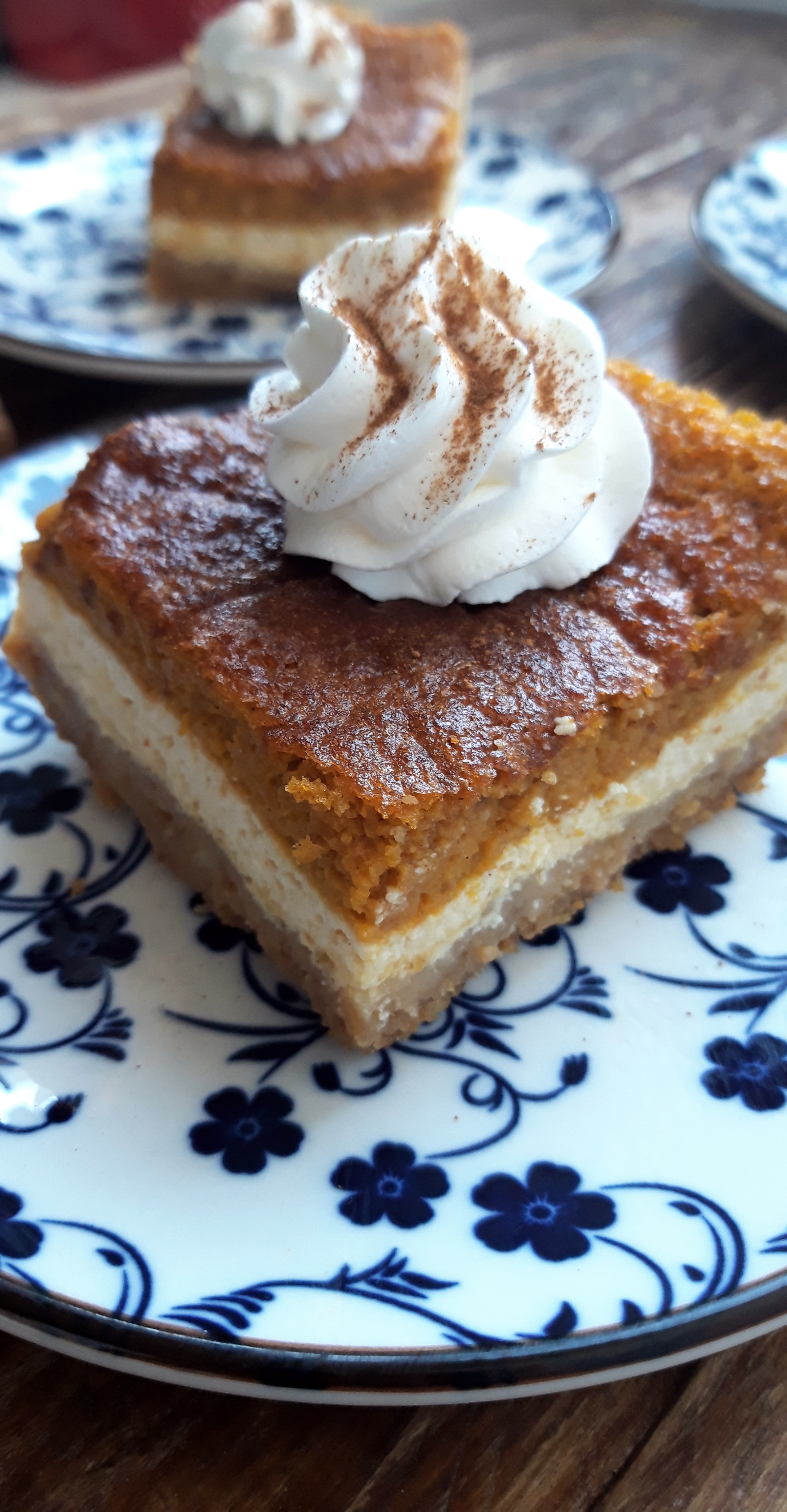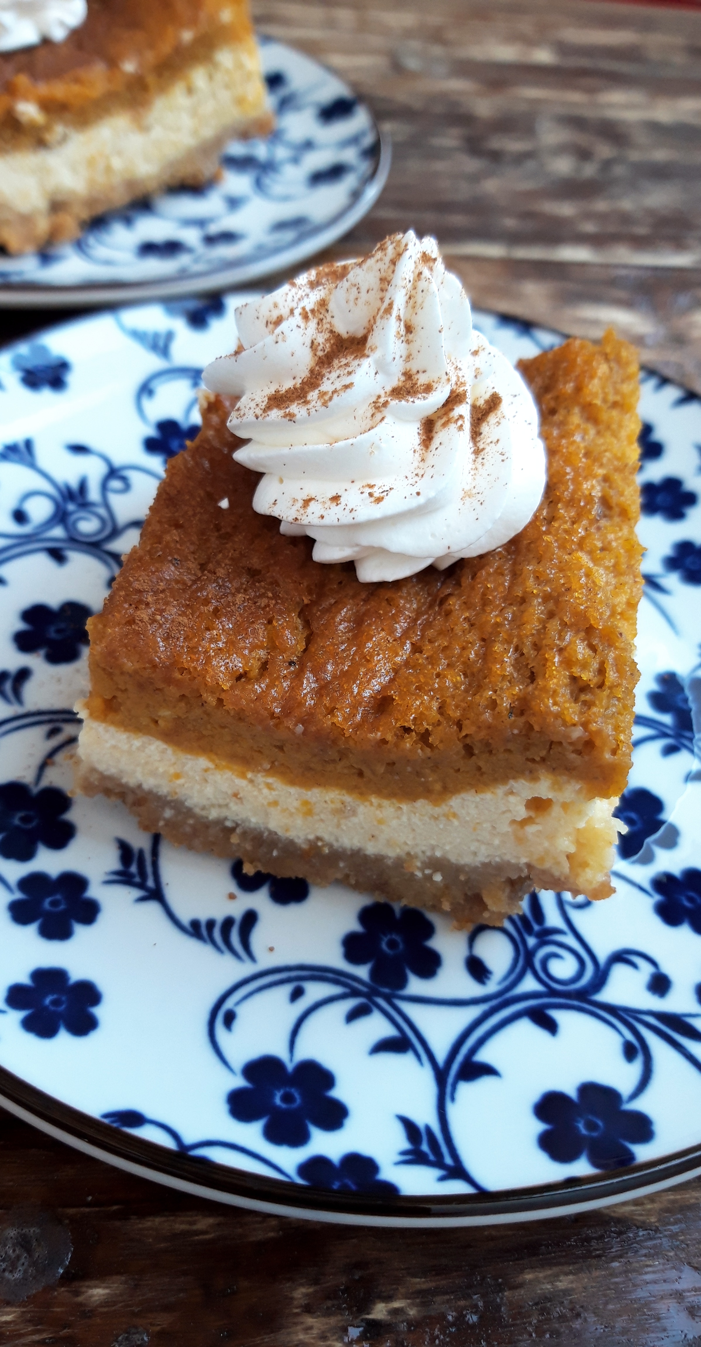Cheesecake është një ëmbëlsirë që preferohet nga shumë njerëz. Në shtëpinë tonë, futet në ëmbëlsirat super të preferuara së bashku me tartën me kungull. Në një nga udhëtimet tona në jug-lindje të Shqipërisë, bleva një kungull të verdhë shumë të shijshëm. Gjysmën e bëra supë dhe pjesën që mbeti më lindi në mendje të bëja një kombinim midis cheesecake me krem djathi dhe tartës me kungull. Edhe pse mund ti bashkoni të dy mbushjet, mendoj se në versioni me dy shtresa të veçanta është më I miri.