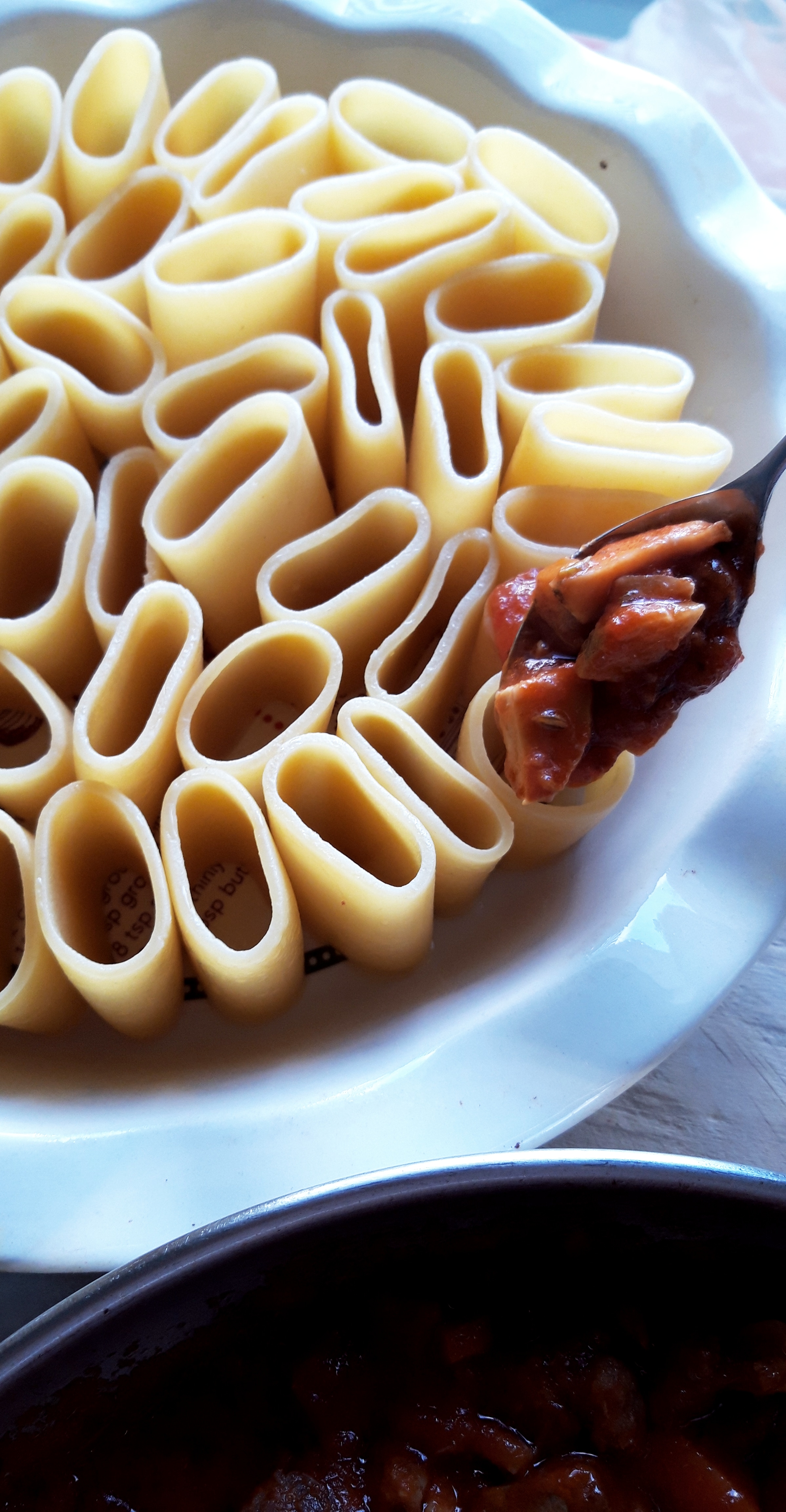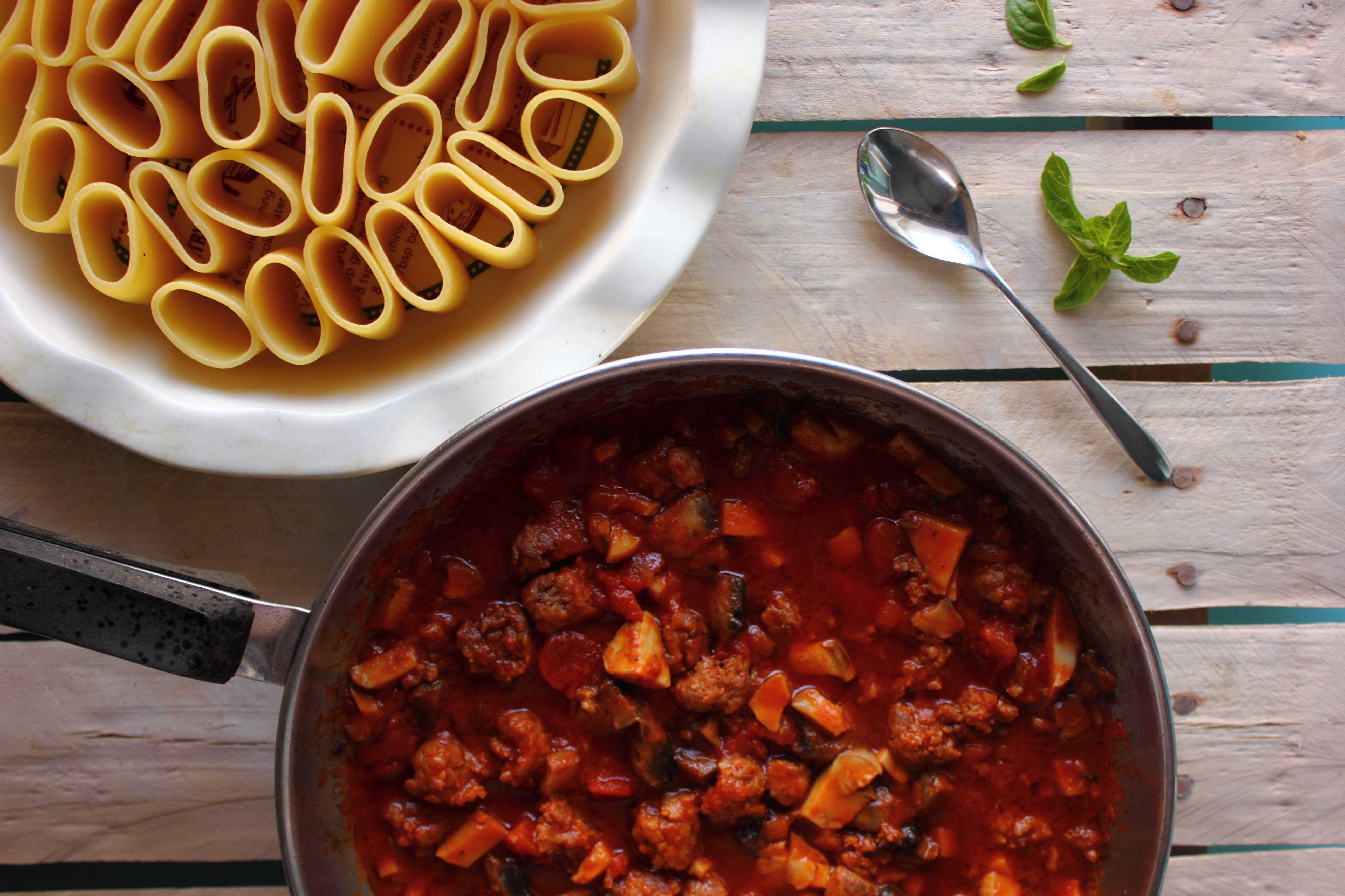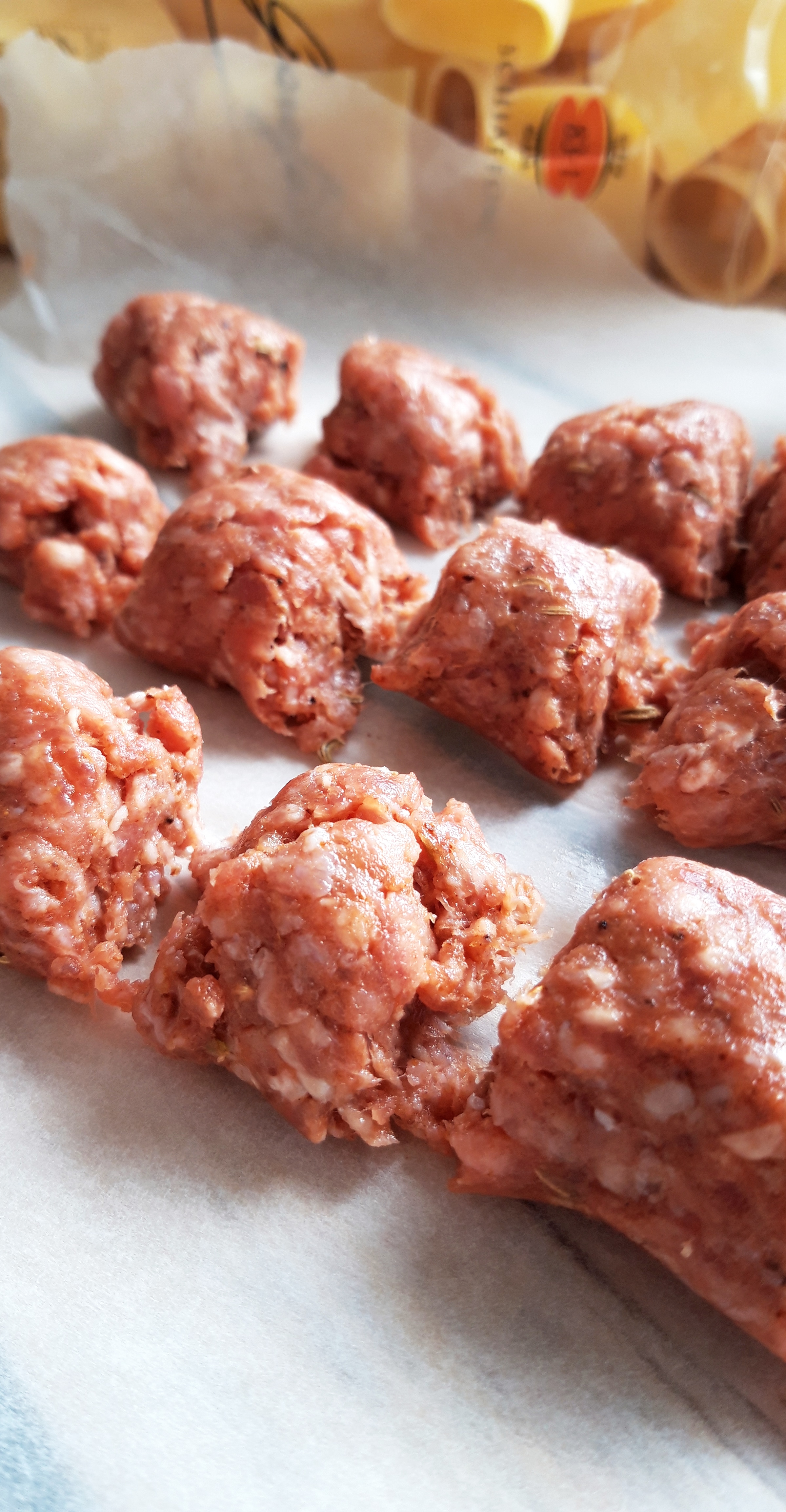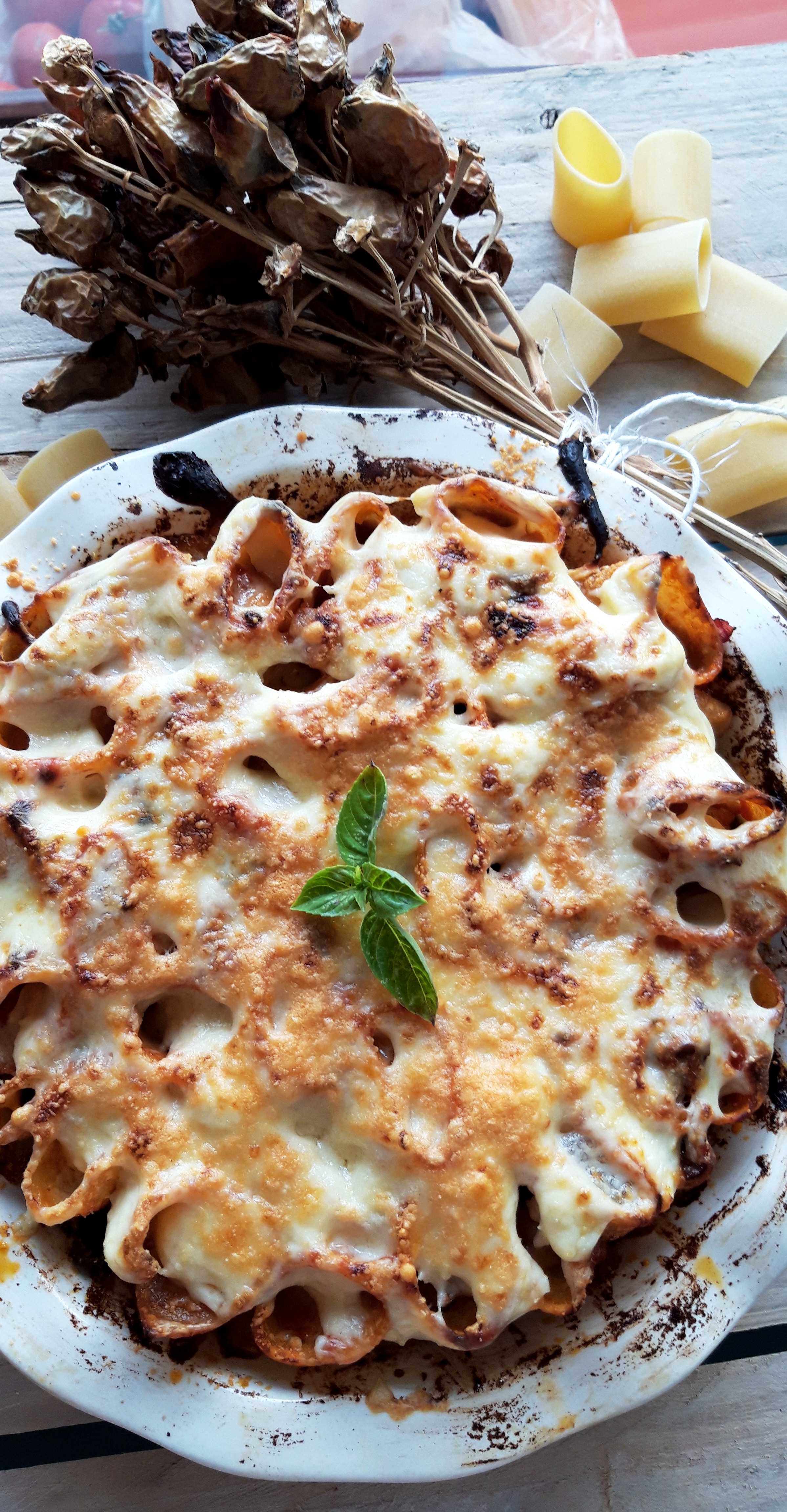 [lt_recipe name=”Makarona paccheri të mbushura me saçiçe të bërë vetë” servings=”4 persona” prep_time=”20M” cook_time=”25M” total_time=”50M” difficulty=”Mesatare” image=”https://bakemydayhappy.com/wp-content/uploads/2018/11/stuffed-paccheri-pasta.jpg” ingredients=”Për salçiçet e bëra në shtëpi:;• 250gr mish i grirë;• 1 lugë çaji fara finoku;• 1 lugë çaji paprika e ëmbël;• 1 lugë çaji pluhur hudhre;• 1 lugë çaji kripë;Për makaronat:;• 400gr makarona të tipit paccheri;• 5 lugë gjelle djathë grana I grirë;• 1 kavanoz salcë me borzilok;• 3 kërpudha porçini te prera në kubikë;• 1 lugë çaji pastë xhixher-hudhër;• 2 lugë gjelle vaj ulliri;• 2 kupa ujë nga lëngu I makaronave;• 6-7 lugë gjelle salcë beshamel;Për salcën beshamel:;• 1 gotë qumësht;• 50 gr gjalpë;• 30 gr miell;• Pak arrë moskat dhe kripë për shije;” ]Fillojmë me salçiçet. Në një tas bashkoni gjithë përbërësit për salçiçet dhe ndajeni brumin në 3 pjesë; Me duart e lyera me vaj ulliri jepini formë si 3 salçiçe stërgjatëshe. Pritini në copëza me thikë dhe lerini të marinohen për 30 minuta (do na shërbejnë si bazë për salcën e mbushjes për makaronat Paccheri); Vendosim ujin për makaronat dhe sapo të marrë vlim, I hedhim pak kripë dhe shtojmë makaronat të cilat duhet të zihen vetëm për gjysmën e kohës që ka në paketim; Në një tigan skuqim në vaj ulliri pastën xhinxher-hudhër (receta është në blog); Shtojmë salçiçet dhe I skuqim paksa. Shtojmë kërpudhat, salcën me brozilok dhe 1 kupë nga uji I makaronave. E lëmë salcën të trashet pak (5 minuta); Ndezim furrën në 220˚C; Kullojmë makaronat dhe I rreshtojmë në këmbë në një tavë rrumbullake si në foto. Marrim mbushjen e cila tashmë është gatuar dhe me një lugë çaji mbushim gjithë makaronat. Pjesën e mbetur e shtojmë anash në tavë; Shtojmë kupën mbetur nga uji I makaronave dhe e mbulojmë tavën me lëtër alumini; E pjekim në furrë për 20 minuta;Në këtë kohë bëjmë salcën beshamel. Tresim gjalpin në një tigan dhe shtojmë miellin. E trazojmë disa sekonda dhe shtojmë qumështin. E zijemë deri sa salca të trashet dhe në fund e rregullojmë me kripë dhe pak arrë moskat; Ndjerrim taven nga furra dhe I hedhim sipër salcën beshamel dhe djathin grana. E fusim në furrë sa të marrë ngjyrë të florinjtë dhe më pas tavën e kemi gati.[/lt_recipe]Makarona paccheri të mbushura me saçiçe të bërë vetë