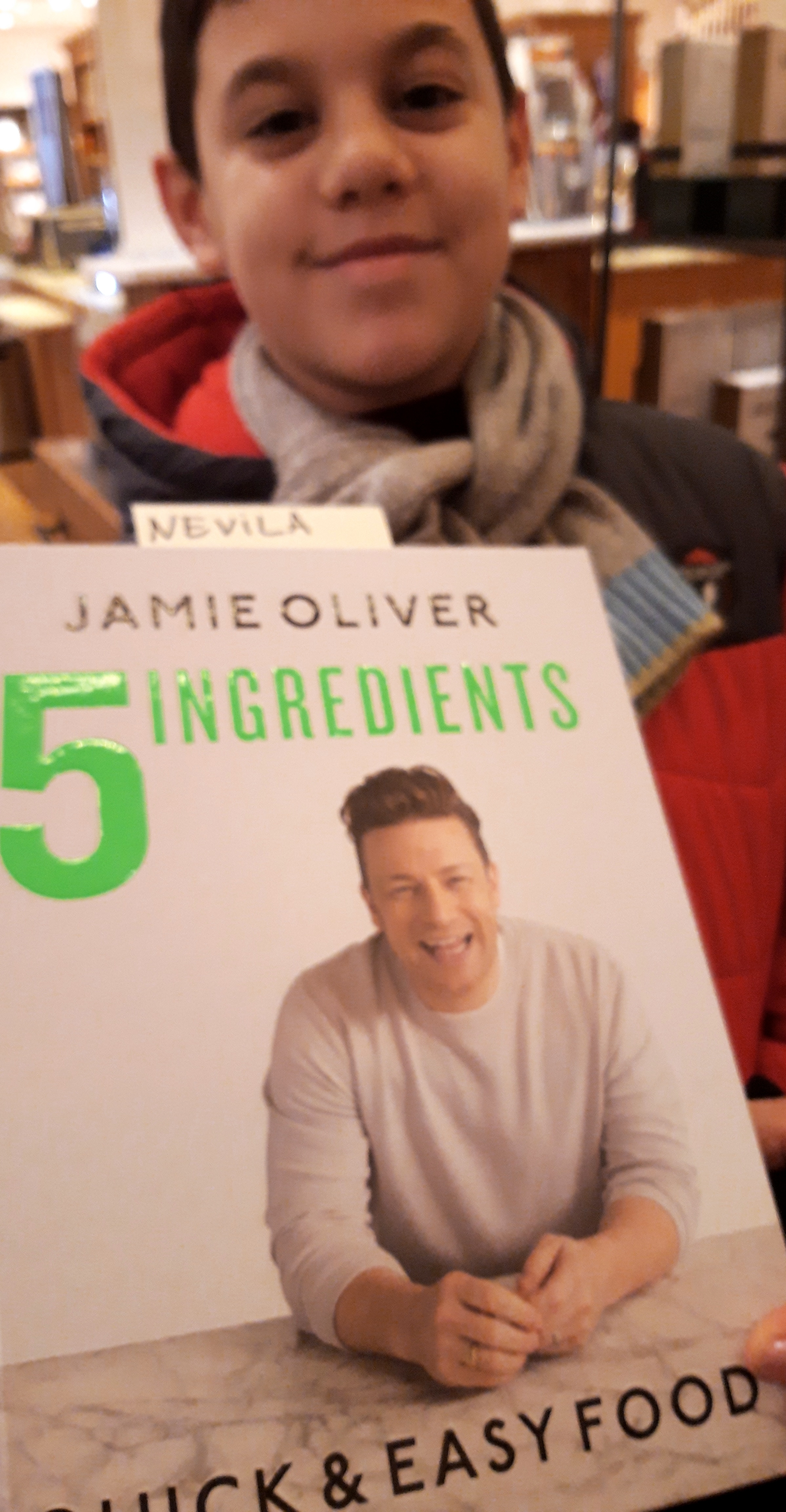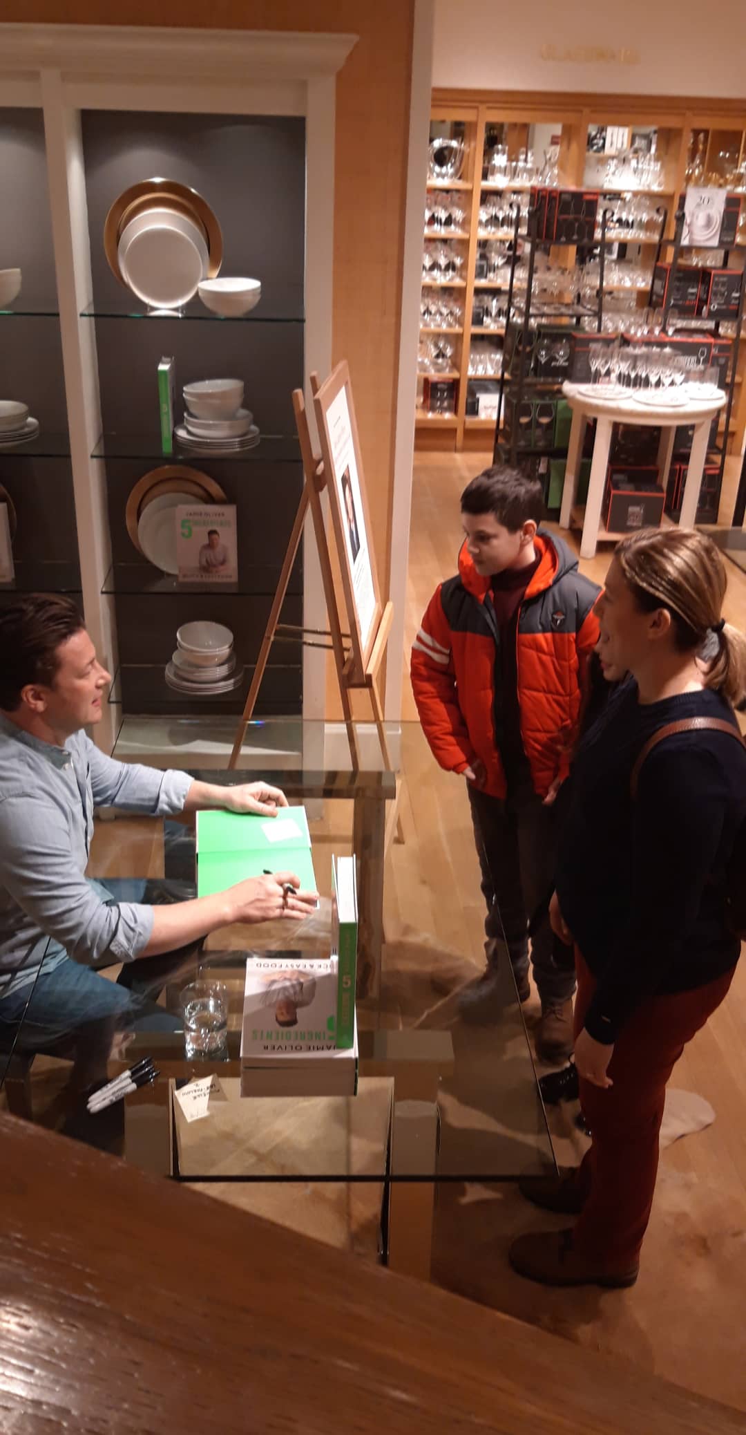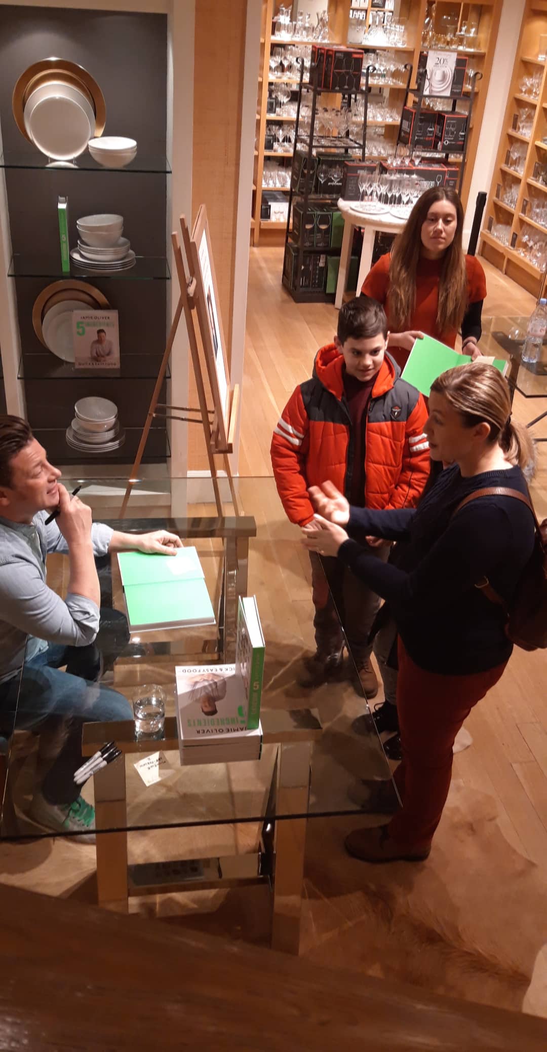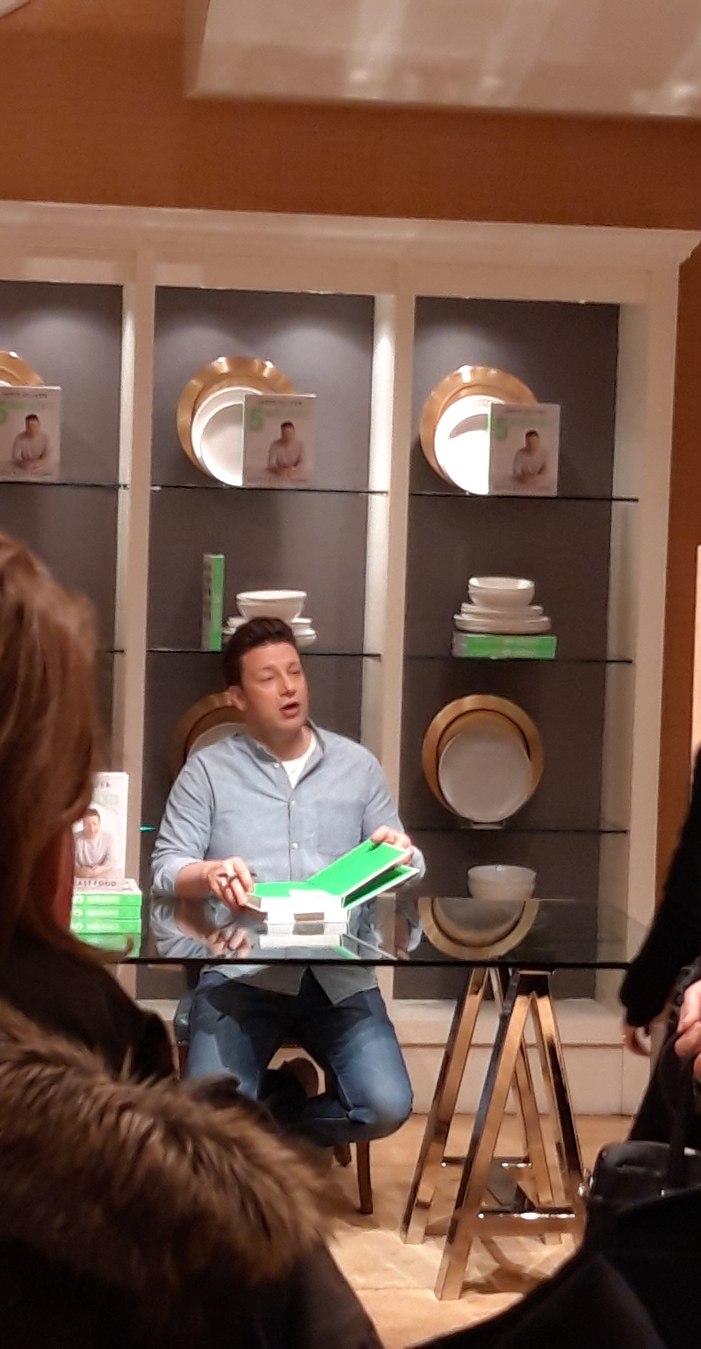 Kaq u desh dhe dita ime ndryshoi. Nuk i besoja syve që Jamie ishte në New York dhe unë do kisha mundësinë ta shihja ( e jo më t’i flisja ☺ ). Në fakt duke e menduar si në Shqipëri (që do bëhej rradhë e madhe për të takuar një VIP) u nisa me një shpresë shumë minimale se do kisha mundësi të merrja autografin e tij. Faktikisht rezultoi që organizatorët ishin perfektë. Rradha vërtet ishte e gjatë, por ecte, pasi fotografitë bëheshin nga punonjësit e dyqanit duke të të lënë tërësisht të qetë të shijoje bisedën 3 minutëshe me Jamie-n. E ndërsa prisnim në rradhë, provuam dy prej recetave të gatuara nga libri i ri i Jamie-t. A ka më mirë se kaq?