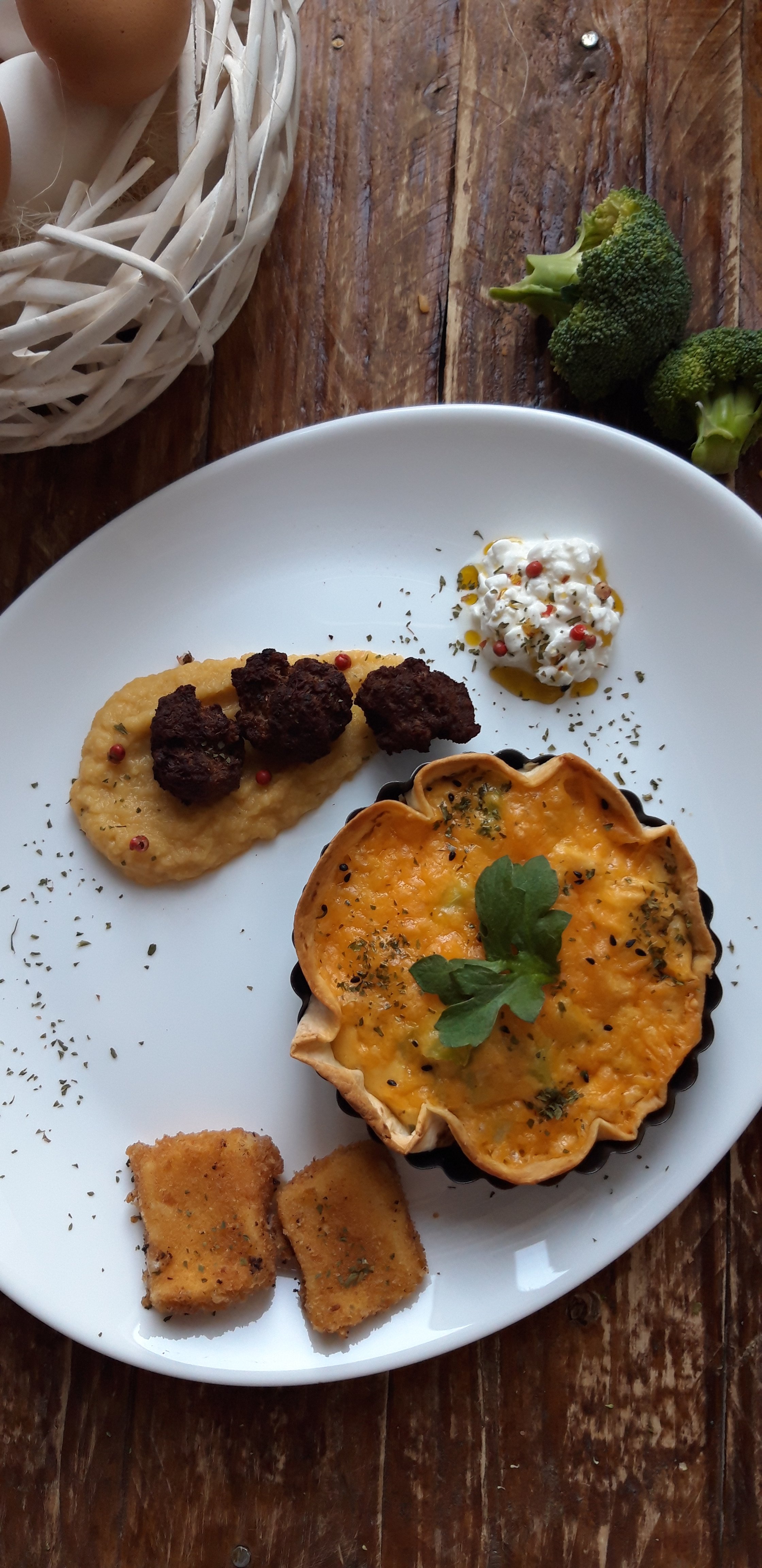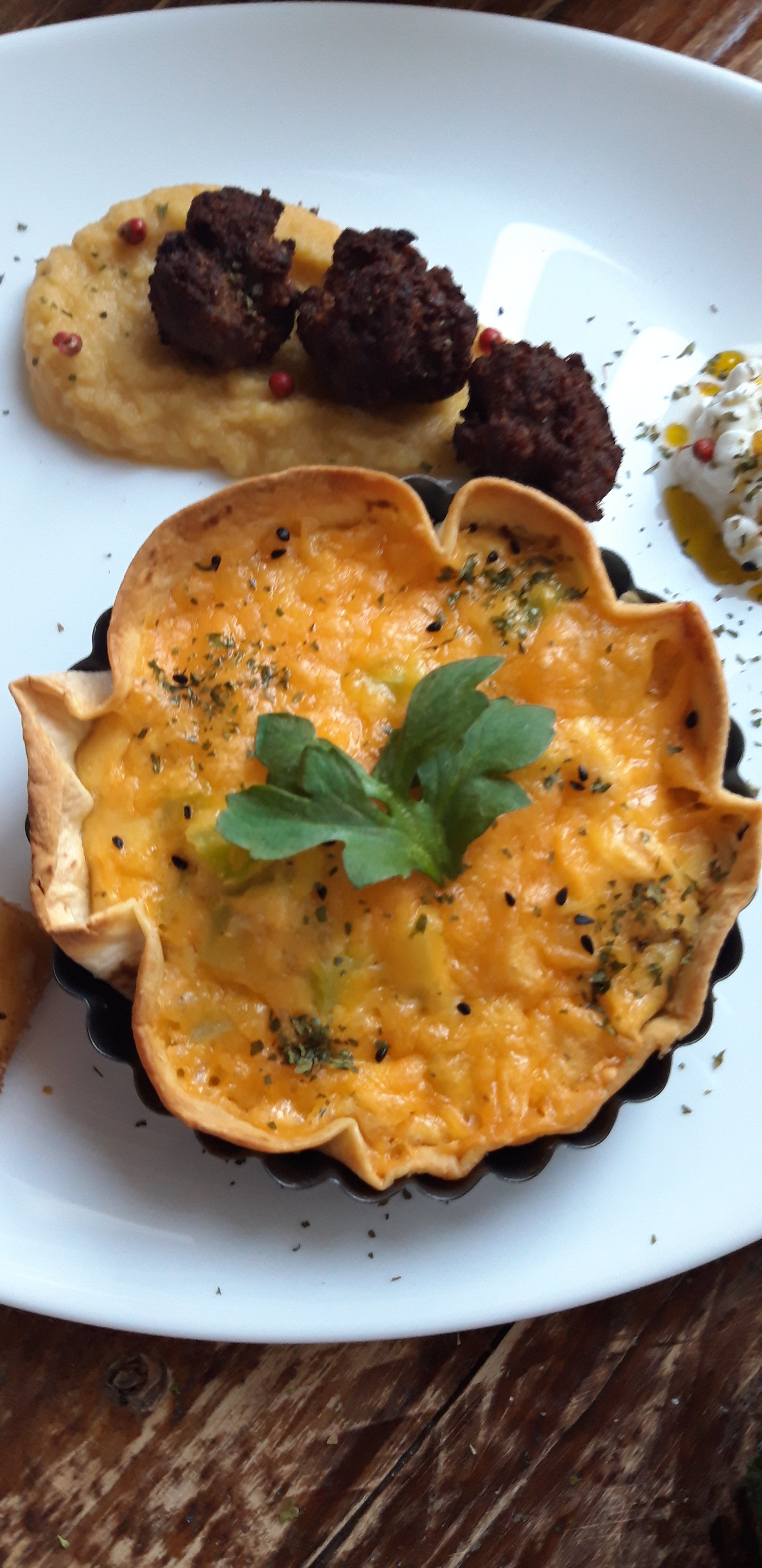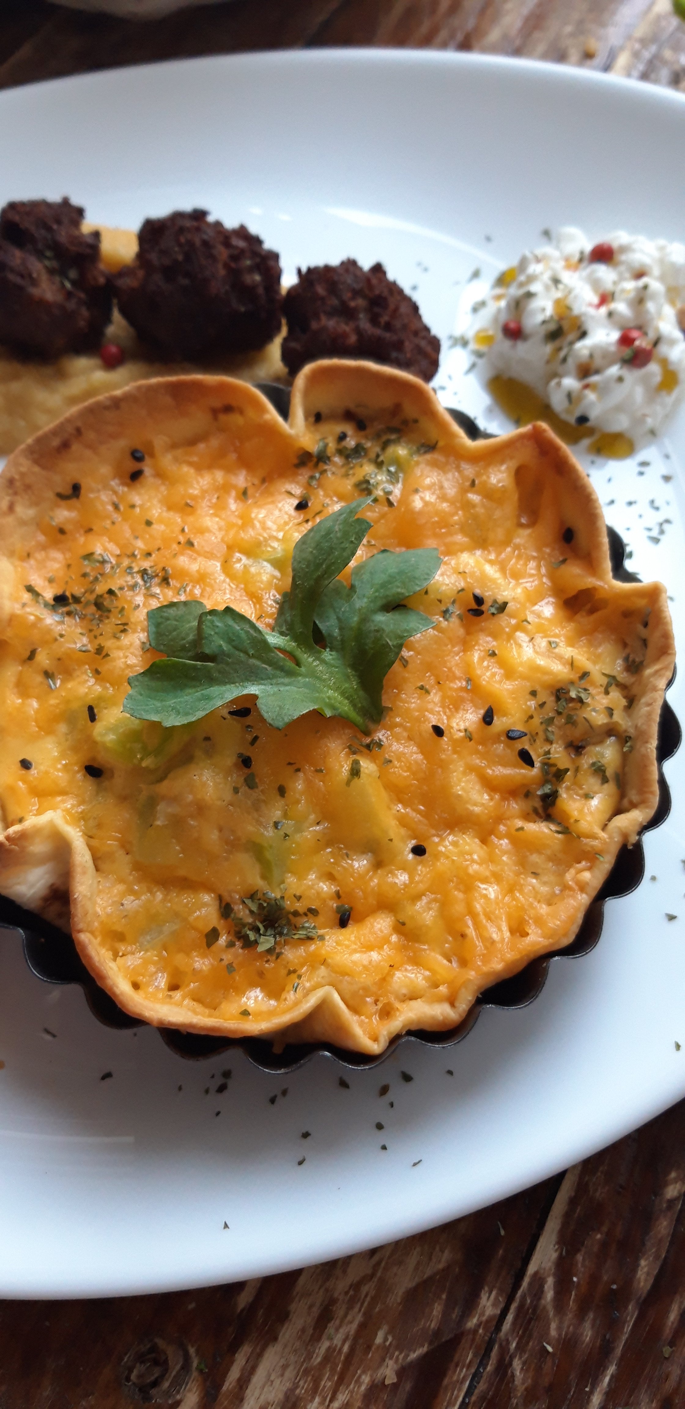 Të dielën e kaluar, ditën që gatova këtë cheesecake me qershi, isha në vështirësi se çfarë do bëja për drekë. Kisha pak mish të grirë që I bëra qofte dhe 2 topinambur (ose mollë dheu) të cilat I bëra pure (thjesht I zieva me pak ujë e vaj ulliri dhe I kalova në mixer). Po deri këtu nuk po më dukej një drekë tamam. Duke hulumtuar nga “konkurrenca” vura re se Iva Tiço kishte përgatitur Quiche me gorgonxola dhe arra (receta këtu). Po unë nuk kisha petë brise, vetëm ca pite tortilla, as djathë gorgonxola, por vetëm cheddar, pak fileto pule të zier dhe ca bishta brokoli. Si përfundim vendosa të shpik këtë version Quiche me pite tortilla dhe rezultati doli super.