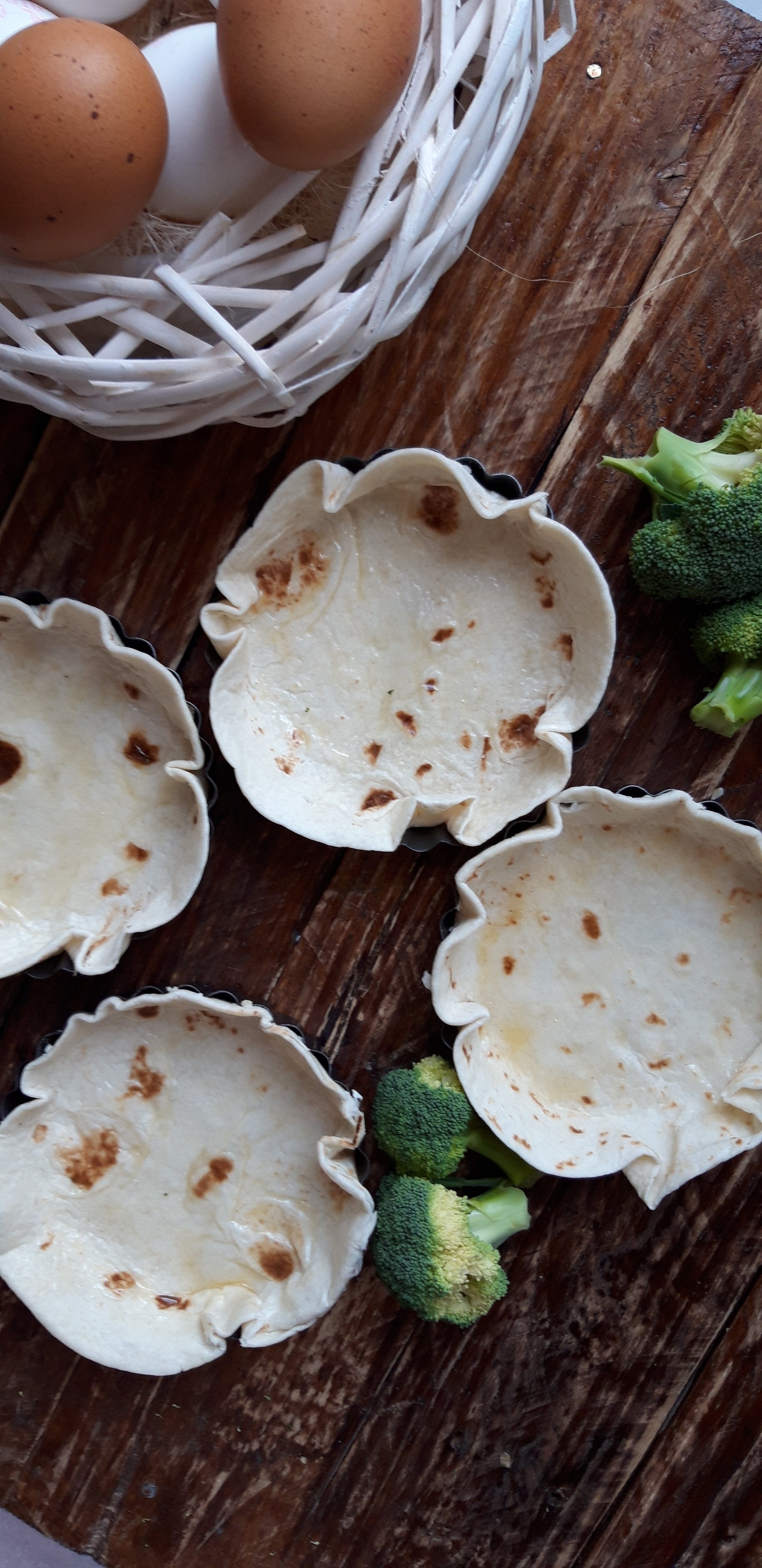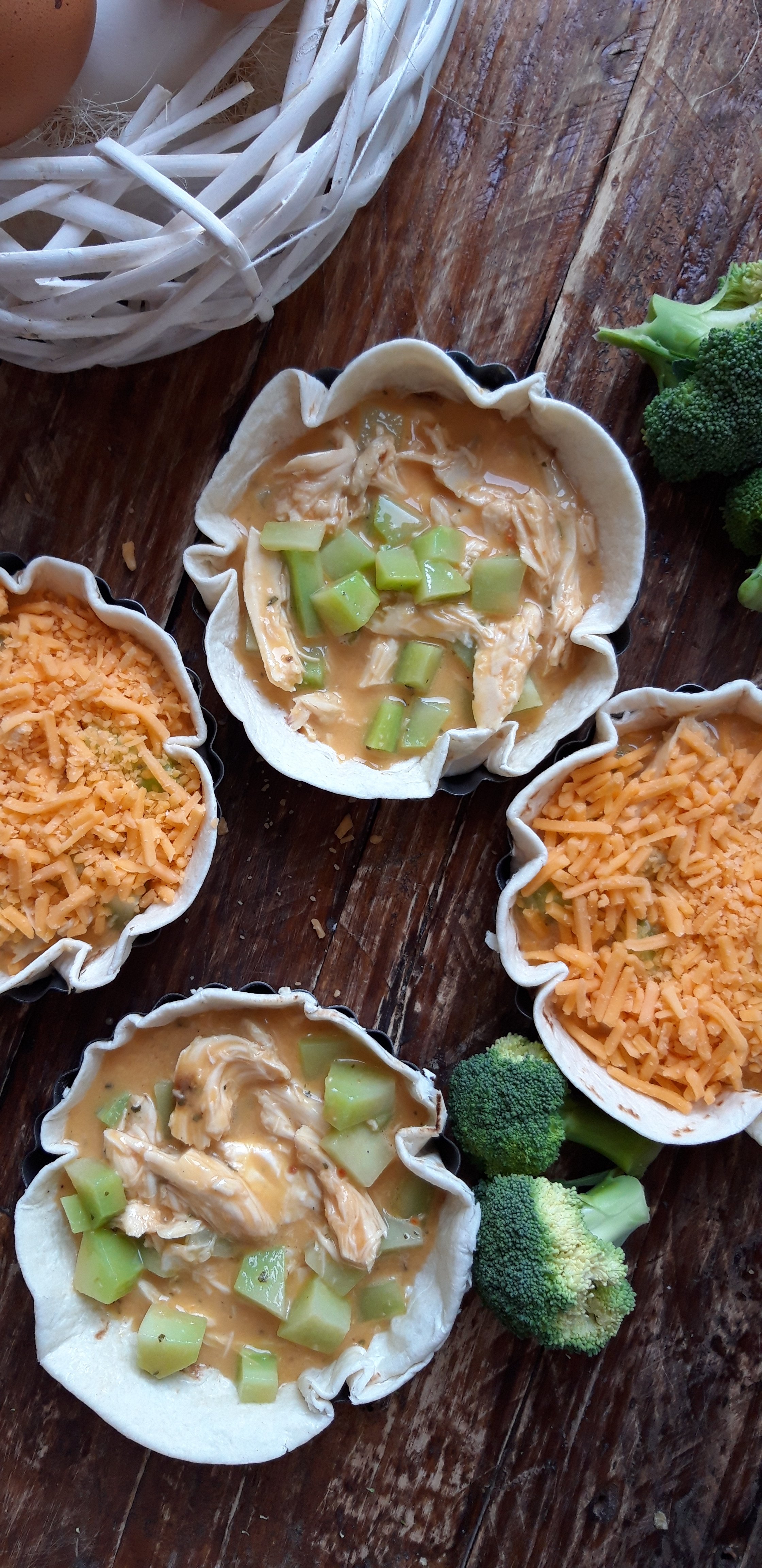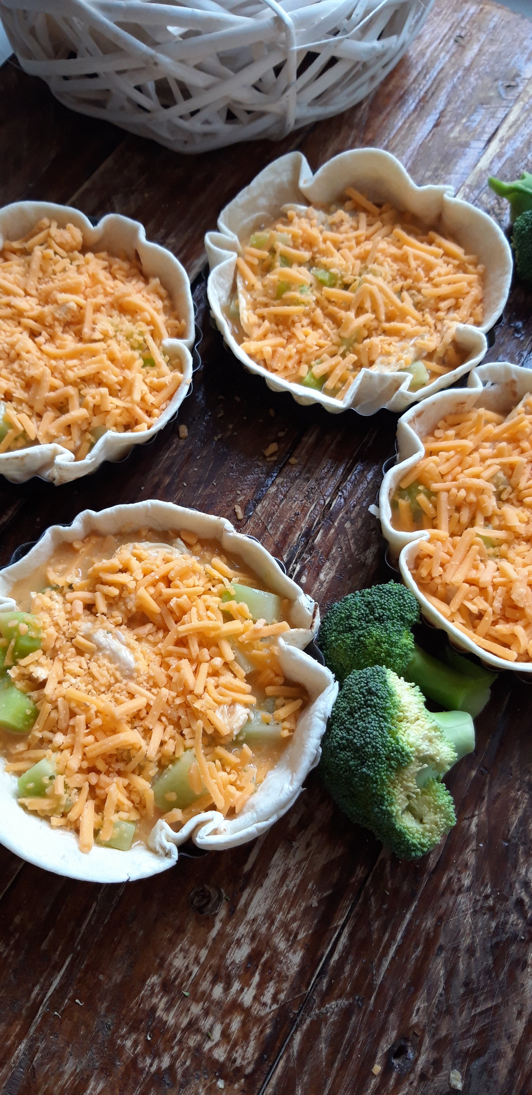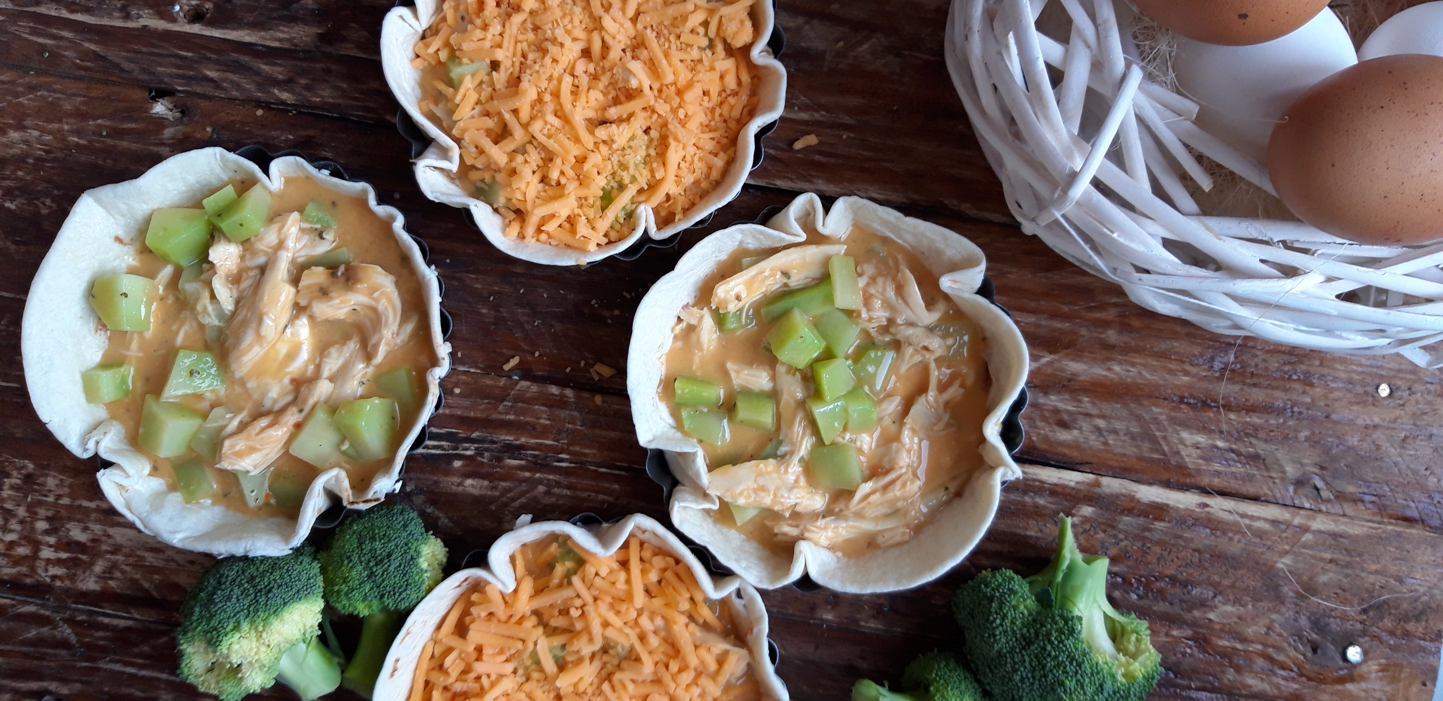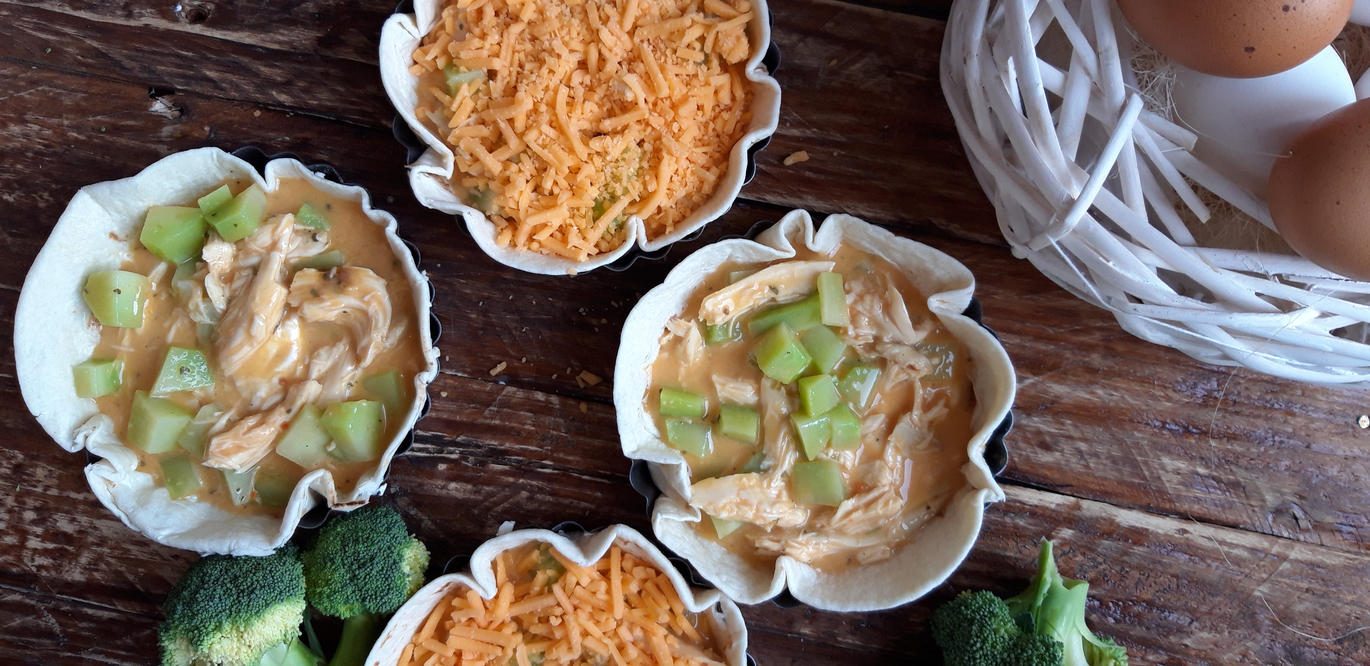[lt_recipe name=”Një version i shpejtë për Quiche” servings=”4 persona” prep_time=”5M” cook_time=”20M” total_time=”25M” difficulty=”E thjeshtë” print=”yes” image=”https://bakemydayhappy.com/wp-content/uploads/2019/01/quiche-me-pite-tortija.jpg” ingredients=”• 4 pite tortilla;• 3 vezë;• 1 lugë gjelle krem qumështi;• 2 bishta brokoli në kuba e të ziera pak;• 100gr fileto pule e zier dhe e copëtuar;• 4 lugë gjelle djathë çedar të grirë;• Kripë dhe piper sipas dëshirës;• Gjalpë të tretur sa për të lyer tavat;” ]Ndizni furrën në 195˚; Lyeni 4 tava individuale me pak gjalpë dhe ngjeshni në të pitet tortilla; Rrihni vezët me kremin e qumështit, shtoni pulën e copëtuar , kubat e brokolit dhe rregulloni me kripë dhe piper; Ndajeni mbushjen midis tavave dhe sipër secilës shtoni djathin e grirë; Piqini tavat në furrë për gati 20 minuta ose deri sa djathi të ketë marrë ngjyrë të këndshme[/lt_recipe]Një version i shpejtë për Quiche