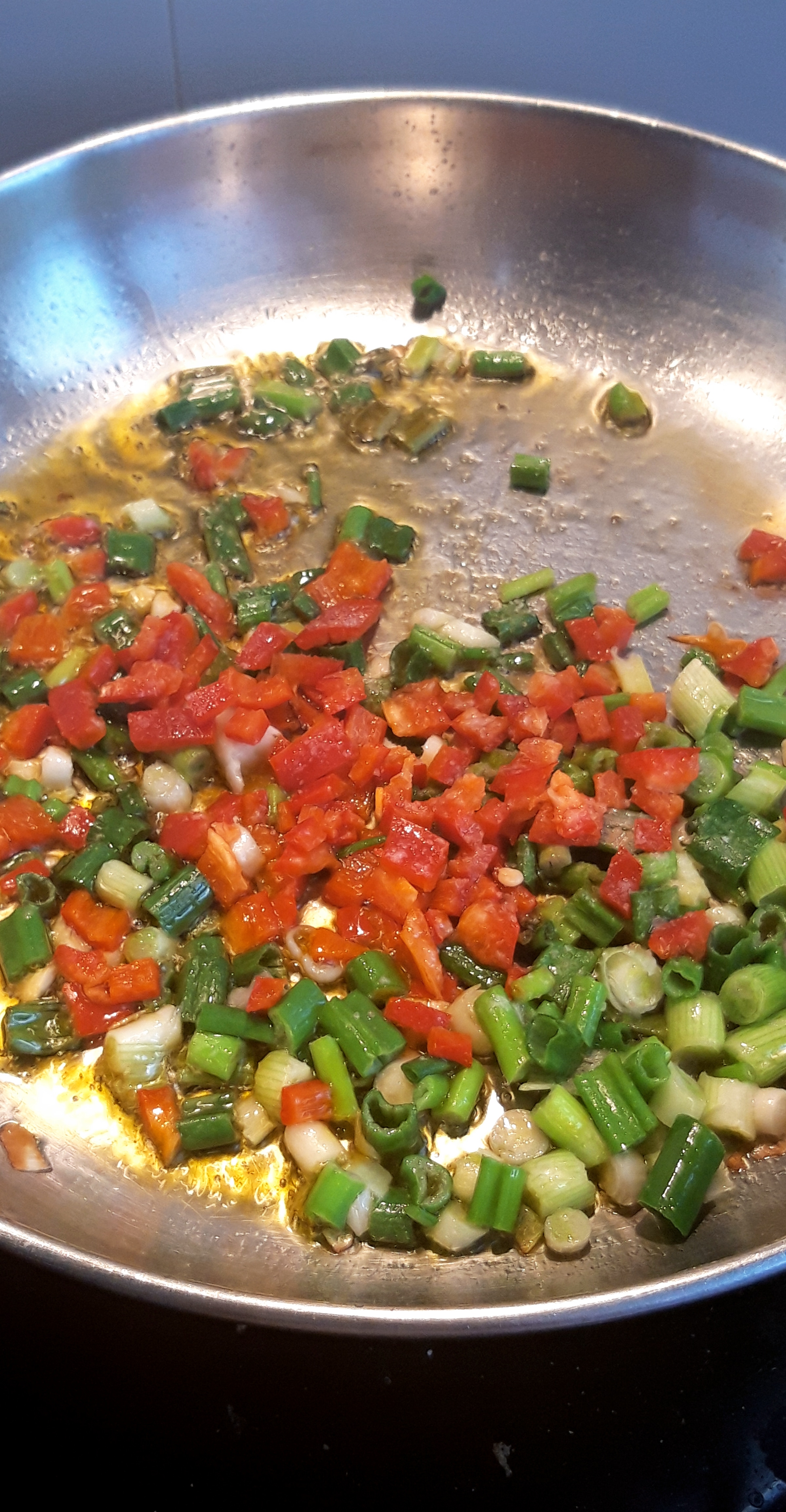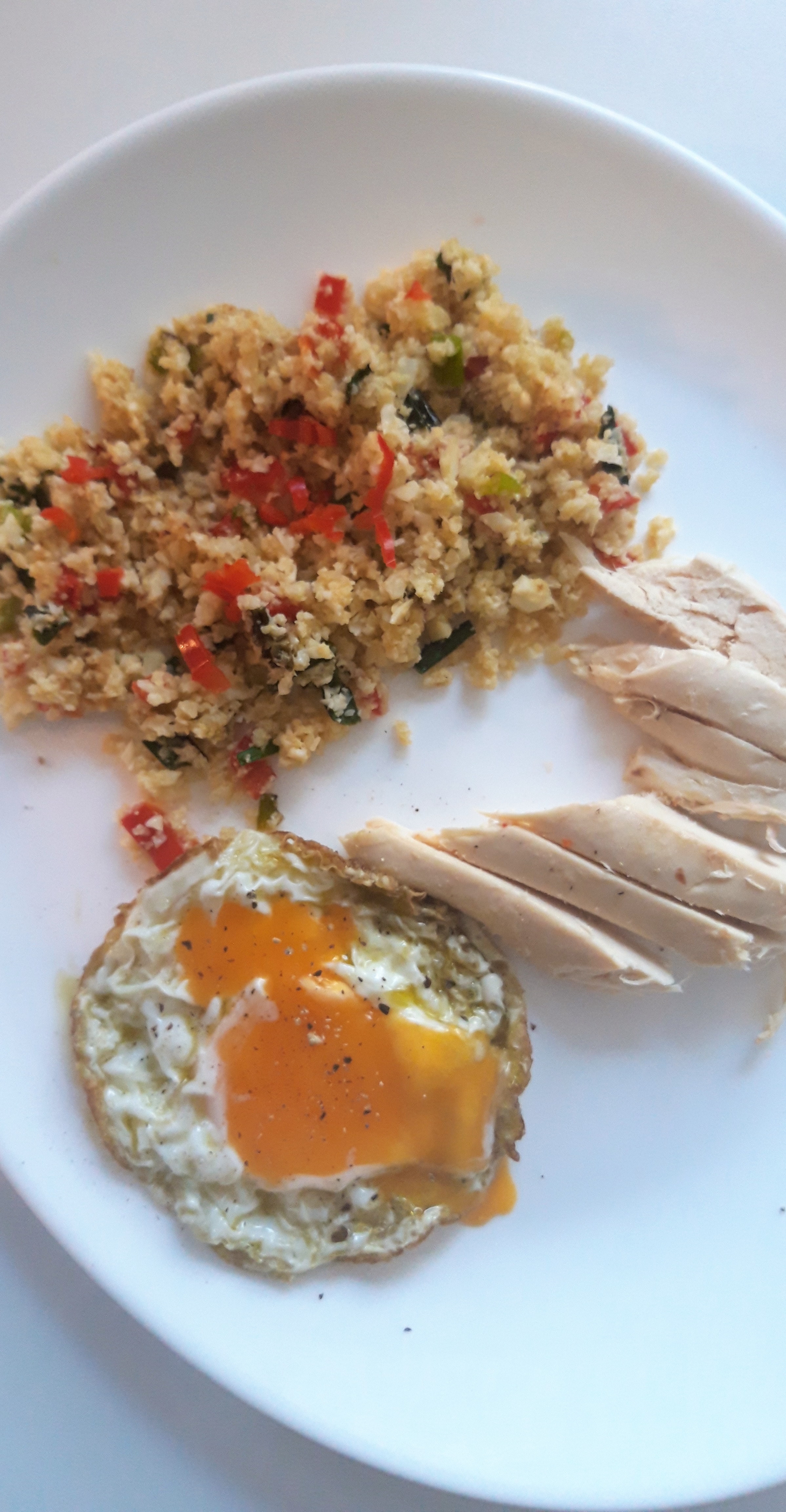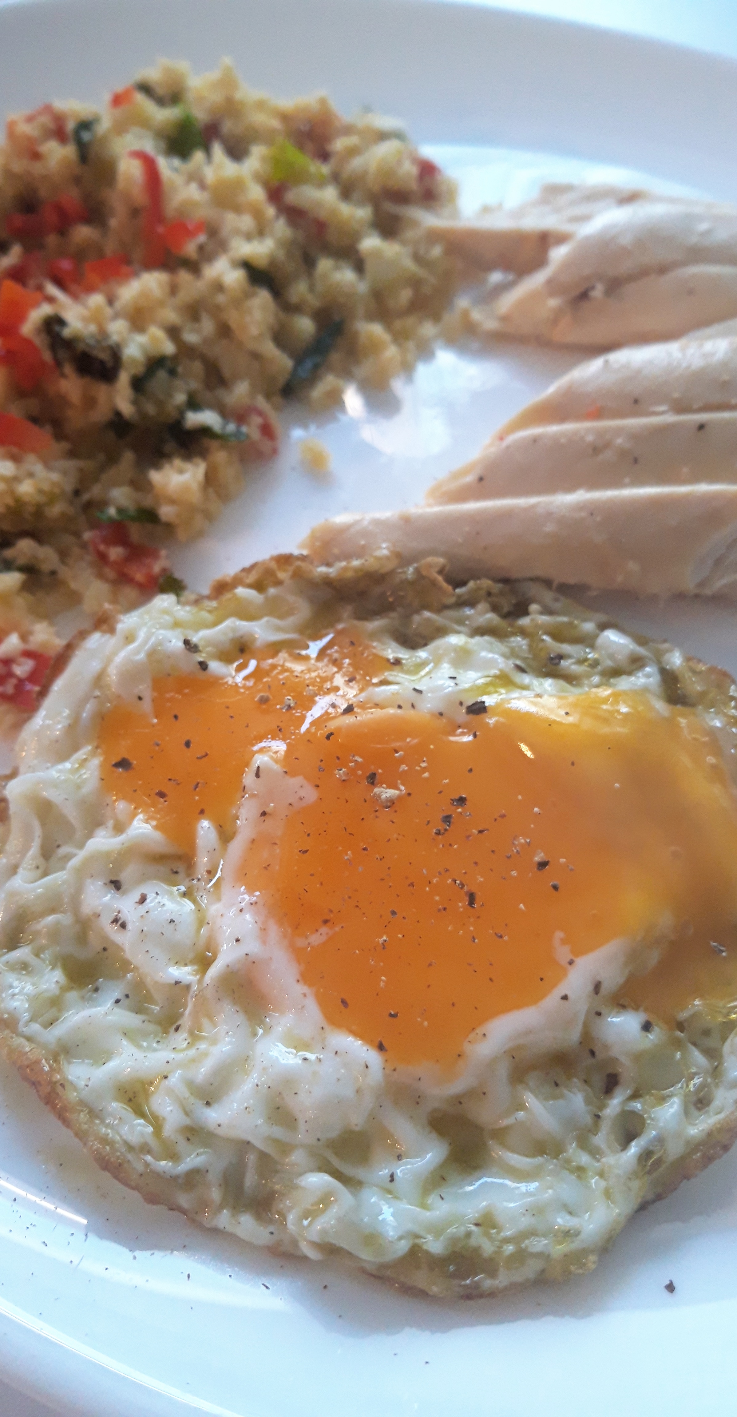Dita e diel ishte shumë interesante. Për drekë konsumuam si familje pjesë të pulës së pjekur që më kish mbetur nga darka e të premtes. Për ta shoqëruar pulën bëra “oriz” lulelakre me spec të kuq, vaj ulliri, qepë të njoma dhe një vezë të skuqur ( që familjes I pëlqeu aq shumë sa skuqa prapë ☺)