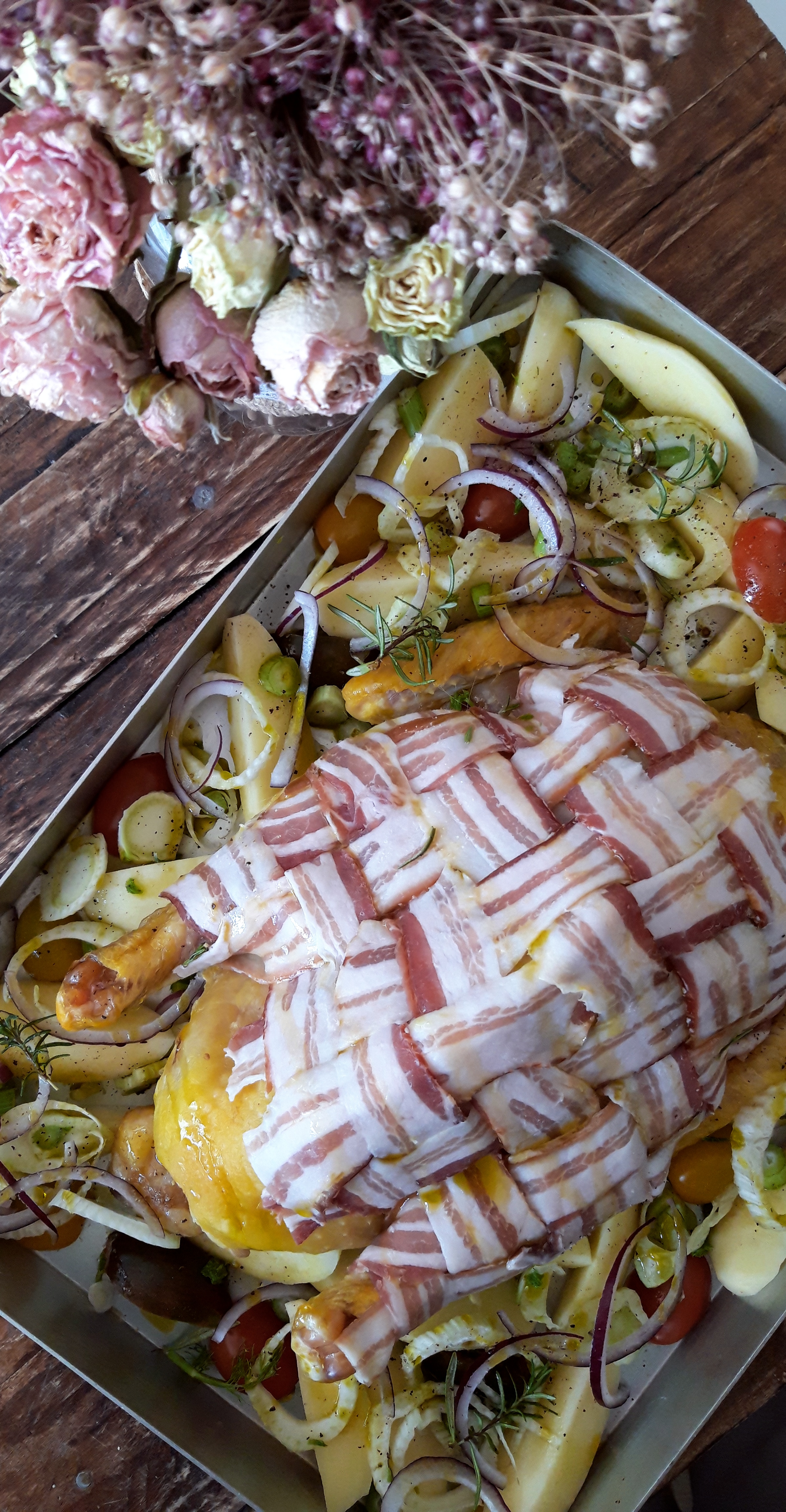 E shoqërova në furrë me finok, qepë, patate, domate të vogla dhe rozmarinë