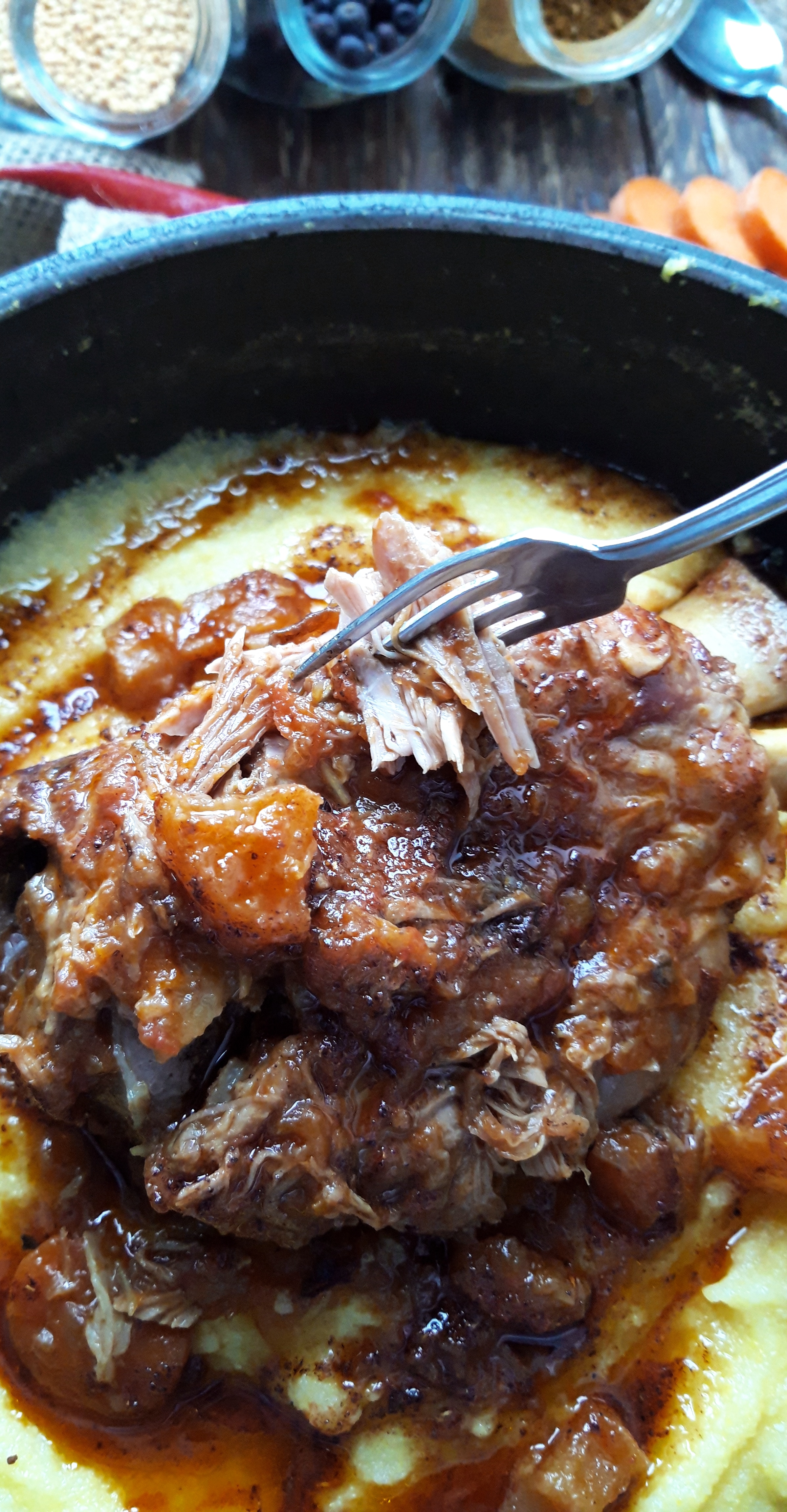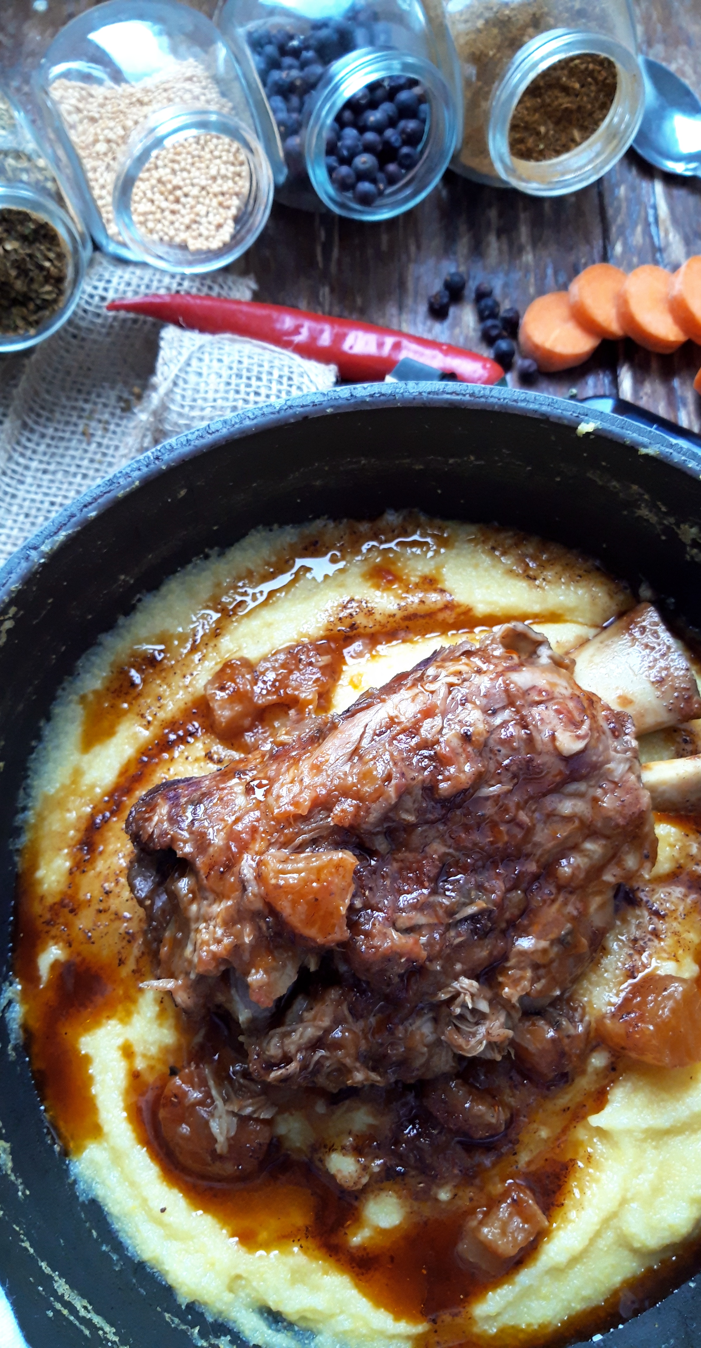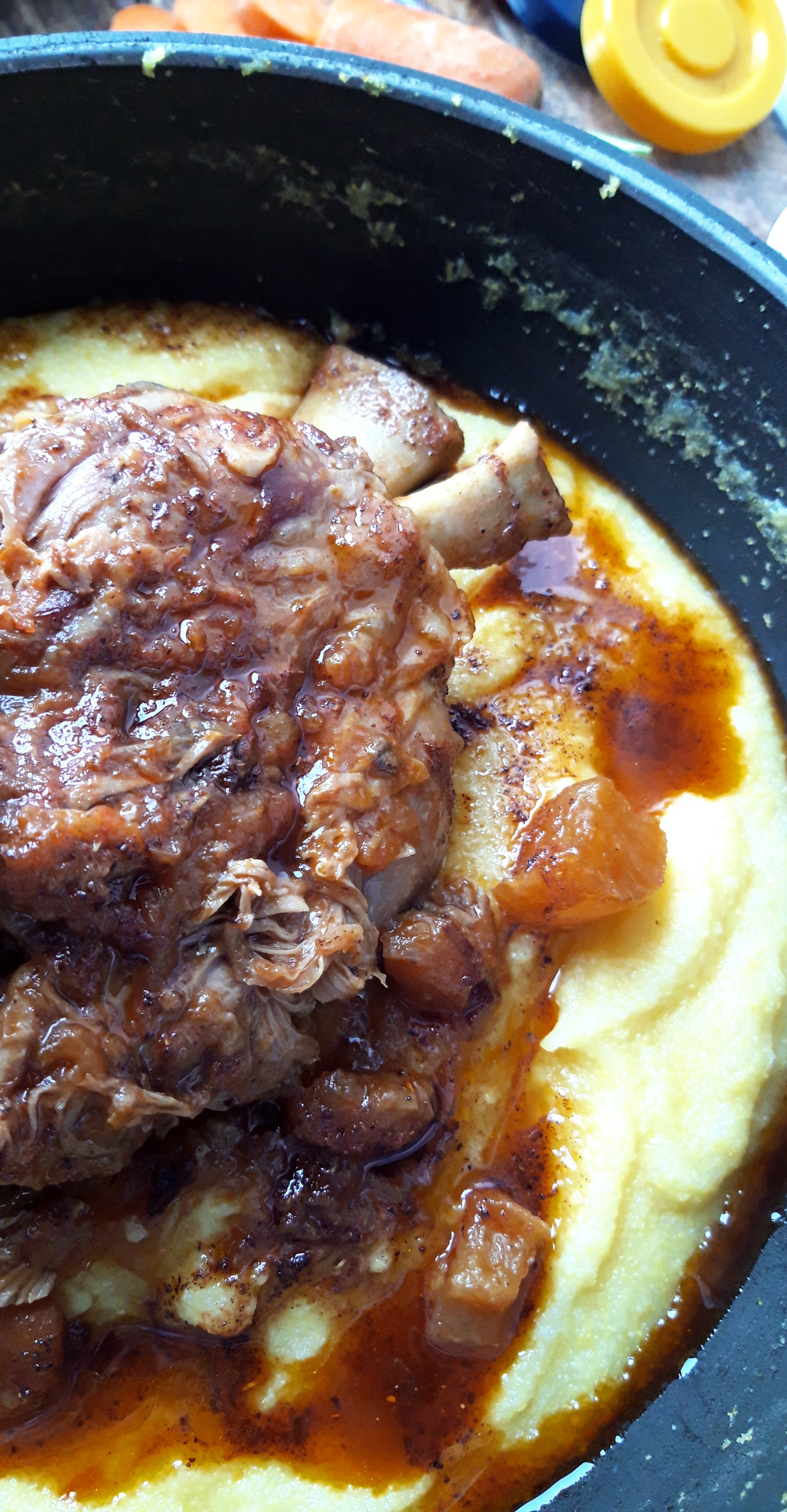 [lt_recipe name=”Muskul gici i shoqëruar me polenta” servings=”4 persona” prep_time=”5M” cook_time=”2H” total_time=”2H5M” difficulty=”Mesatare” print=”yes” image=”https://bakemydayhappy.com/wp-content/uploads/2019/04/IMG_20190410_133828_147-1-533×1024.jpg” ingredients=”Për muskujt e gicit:;• 2 muskuj gici ( 250gr secili);• 4 lugë gjelle vaj ulliri ;• 1 finok;• 1 qepë;• 1 karrotë;• 1 rrepë Daikon;• 2 kokrra dëllinjë;• 2 domatë ;• 1 lugë çaji tym I lëngshëm (opsionale);• ½ kupë verë e kuqe;• 3 kupa ujë;• Kripë dhe piper sipas dëshirës;Polenta:;• 3 kupa ujë;• 1 kupë miell për polenta;• 1 lugë gjelle vaj ulliri;• 1 lugë çaji kripë ;” ]Unë përdora tenxhere gize por çdo tenxhere me fund të trashë bën punë; Ngrohni vajin e ullirit dhe skuqni muskujt e gicit, duke I rrotulluar që të skuqen mirë nga të gjithë anët. Shtoni finokun, karrotën, rrepën të prera në kuba dhe më pas qepën dhe kokrrat e dëllinjës. Skuqini mirë sa të marrin pak ngjyrë dhe shtoni verën e kuqe; Lereni te gatuhet sa të avullojë paksa, pastaj shtoni domatet e grira, ujin dhe rregulloni me kripë dhe piper; Vendosini kapakun dhe lereni të gatuhet në temperaturë shumë të ulët për gati 2 orë, aq sa të shkëputet mishi nga kocka;m Pesëmbëdhjetë minuta para se mishi të jetë gatuar përgatisni polentën; Zieni ujin me vajin e ullirit e kripën dhe shtoni me kujdes miellin e polentës, duke e trazuar paralelisht me lugë druri. Gatuajeni polentën sa të trashet, t’i ngjajë disi puresë së patateve; Shërbejeni akoma të nxehtë e me një gotë verë të kuqe;[/lt_recipe]
