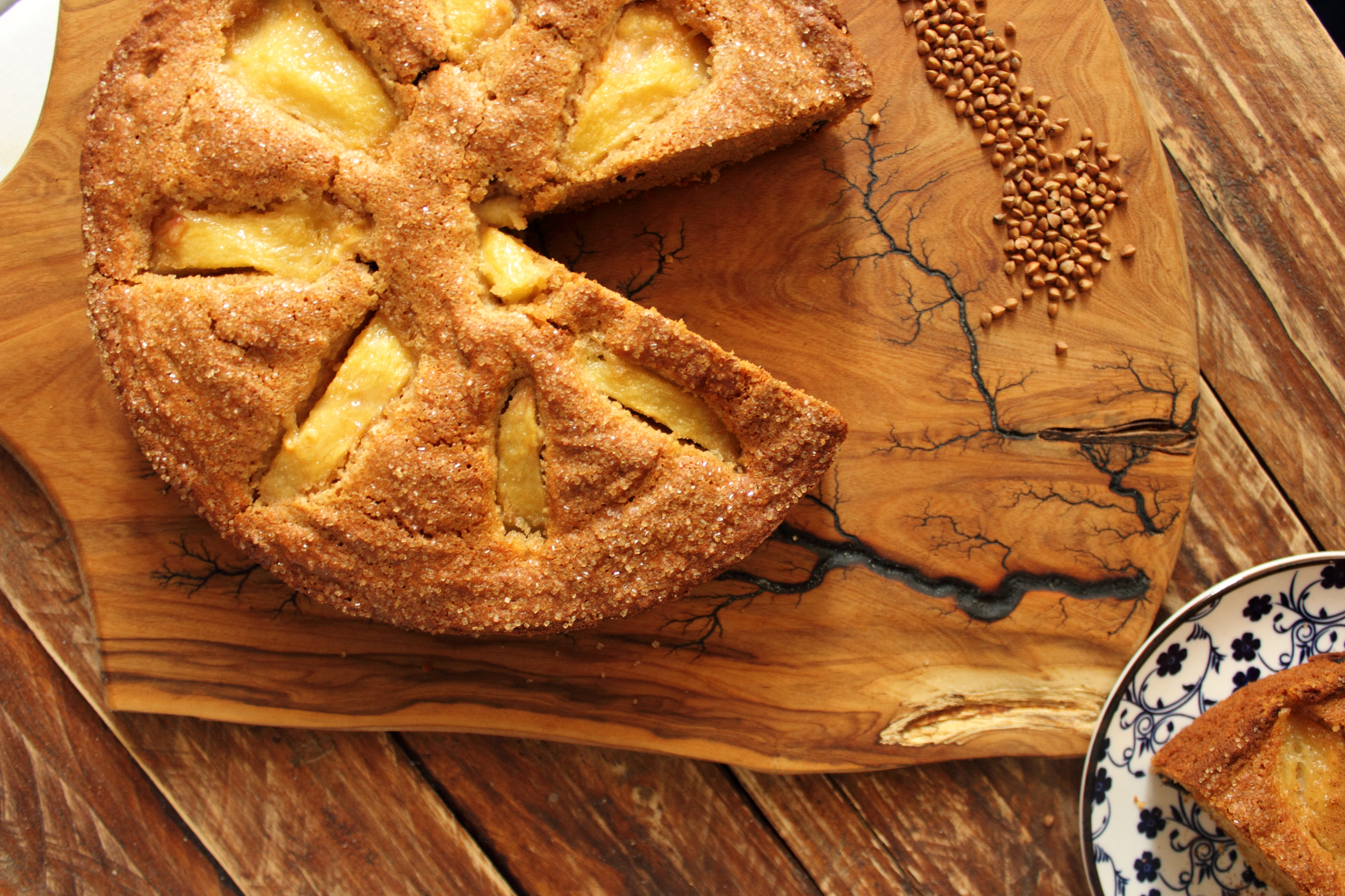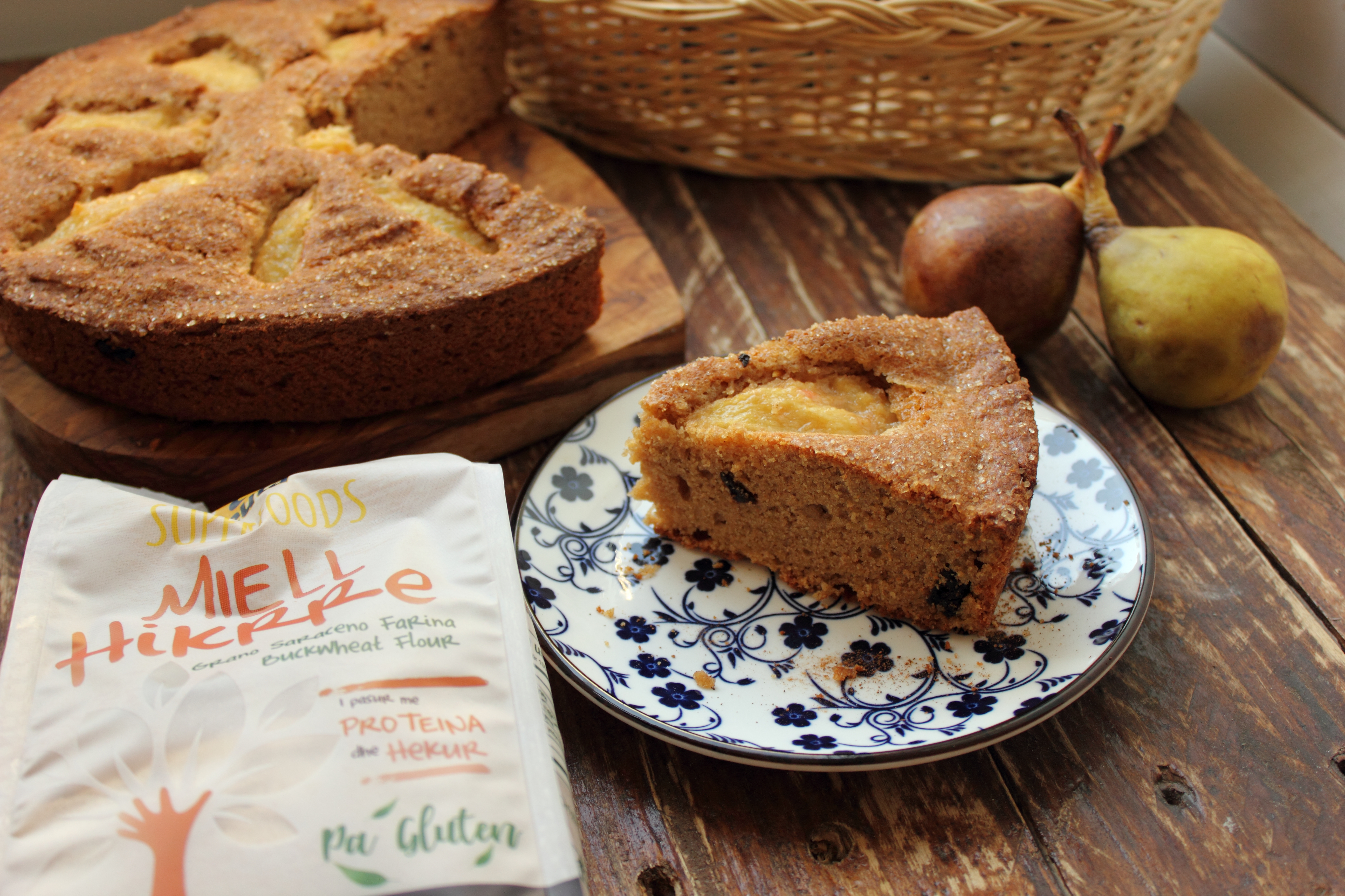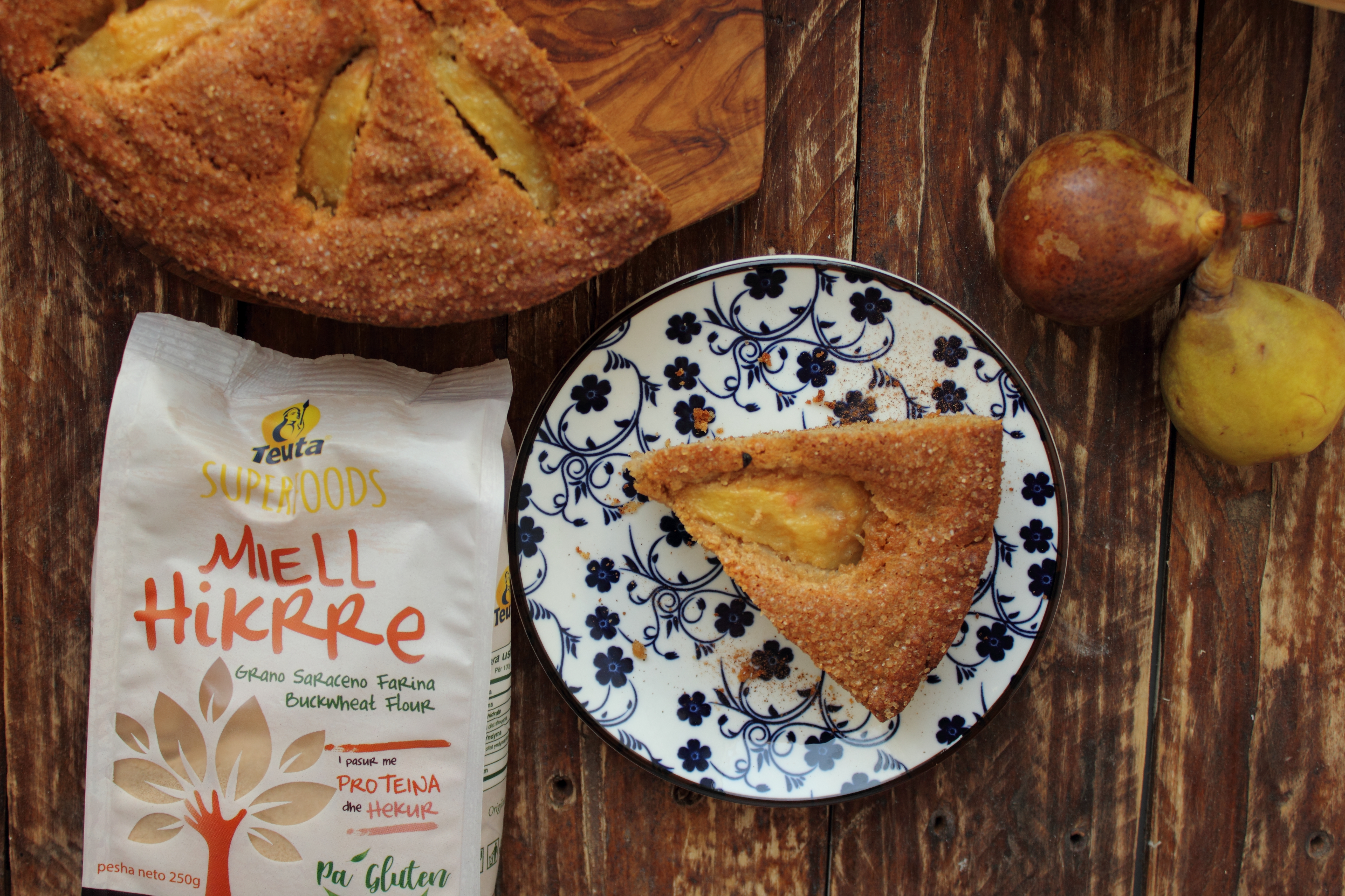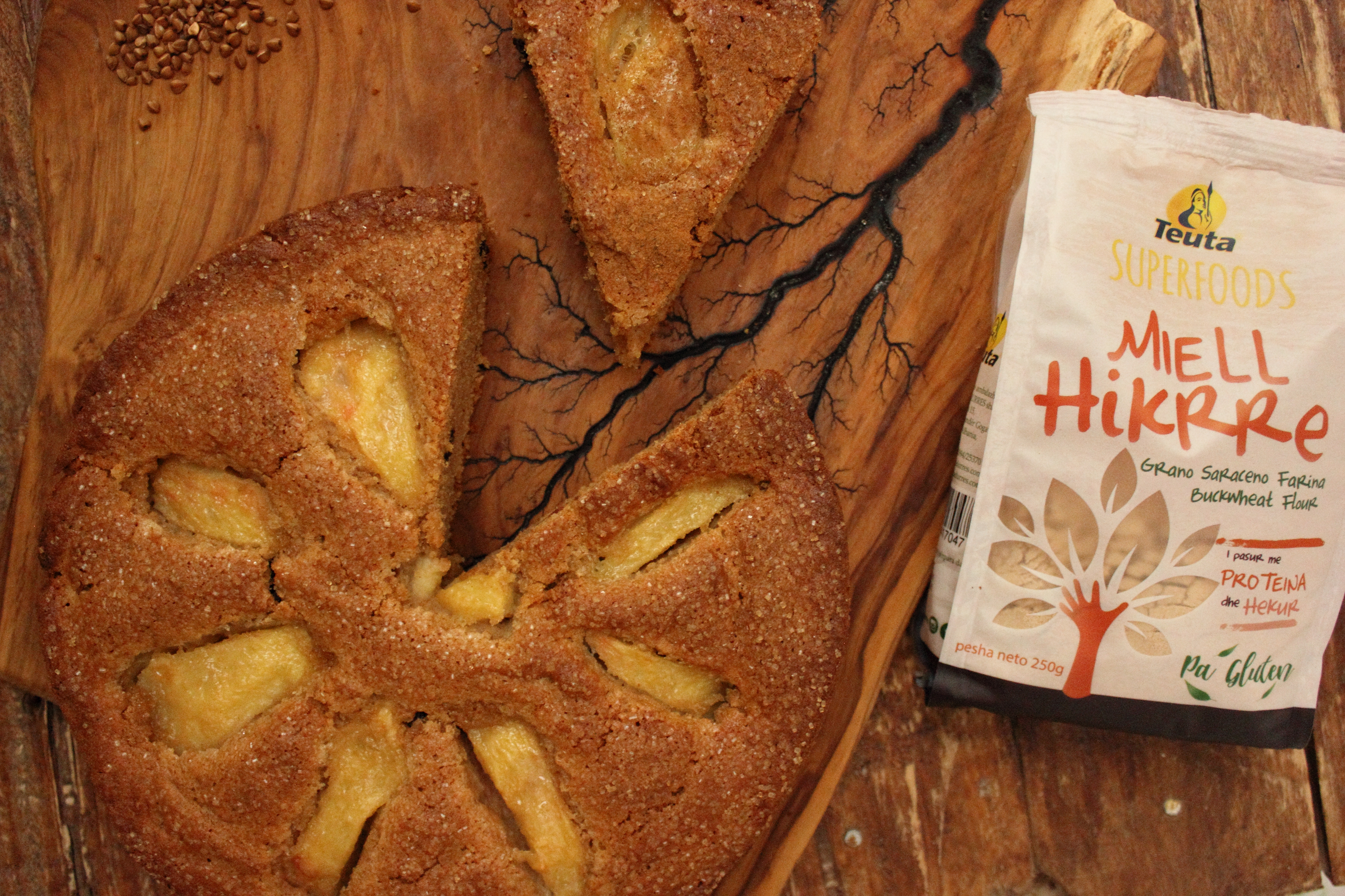 [lt_recipe name=”Kek pa gluten me dardha dhe miell hikrre” servings=”8 racione” prep_time=”5M” cook_time=”30M” total_time=”35M” difficulty=”E thjeshtë” print=”yes” image=”https://bakemydayhappy.com/wp-content/uploads/2019/07/buckwheat-cake-6-1024×683.jpg” ingredients=”• 2 dardha të vogla të grira;• 100g sheqer;• 120ml vaj luledielli;• 3 vezë;• 100g miell hikrre Teuta;• 100g miell pa gluten;• 1/2 bustinë pluhur pjekës (10g);• 10 kokrra qershi të thata ;• 1 dardhë e prerë në feta;• 20g sheqer kaf për spërkatje;• Kanellë (opsionale)” ]Ndizni furrën në 180˚C; Në një tas qelqi trazoni dardhat e grira, sheqerin dhe vajin; Shtoni vezët dhe rrihni masën mirë; Më pas shtoni dy llojet e miellrave, pluhurin pjekës, qershitë e thata dhe trazojeni mirë; Ky kek nuk ka nevojë për mikser elektrik pasi një rrahëse dore e kryen shumë mirë funksionin; Hidheni masën e brumit në një tavë me diametër 20 cm të cilën e keni lyer paraprakisht me vaj dhe miell dhe nivelojeni me lugë; Vendosni fetat e dardhes si në foto, spërkateni mirë me sheqer kaf dhe piqeni për 30 minuta ose derisa maja e thikës e futur në mes të dalë e thatë; Për ta servisur, nëse dëshironi mund ta spërkatni me pak kanellë. Ky kek ka një shije të theksuar dhe mund të shoqërohet perfekt me një kapuçino.[/lt_recipe]
