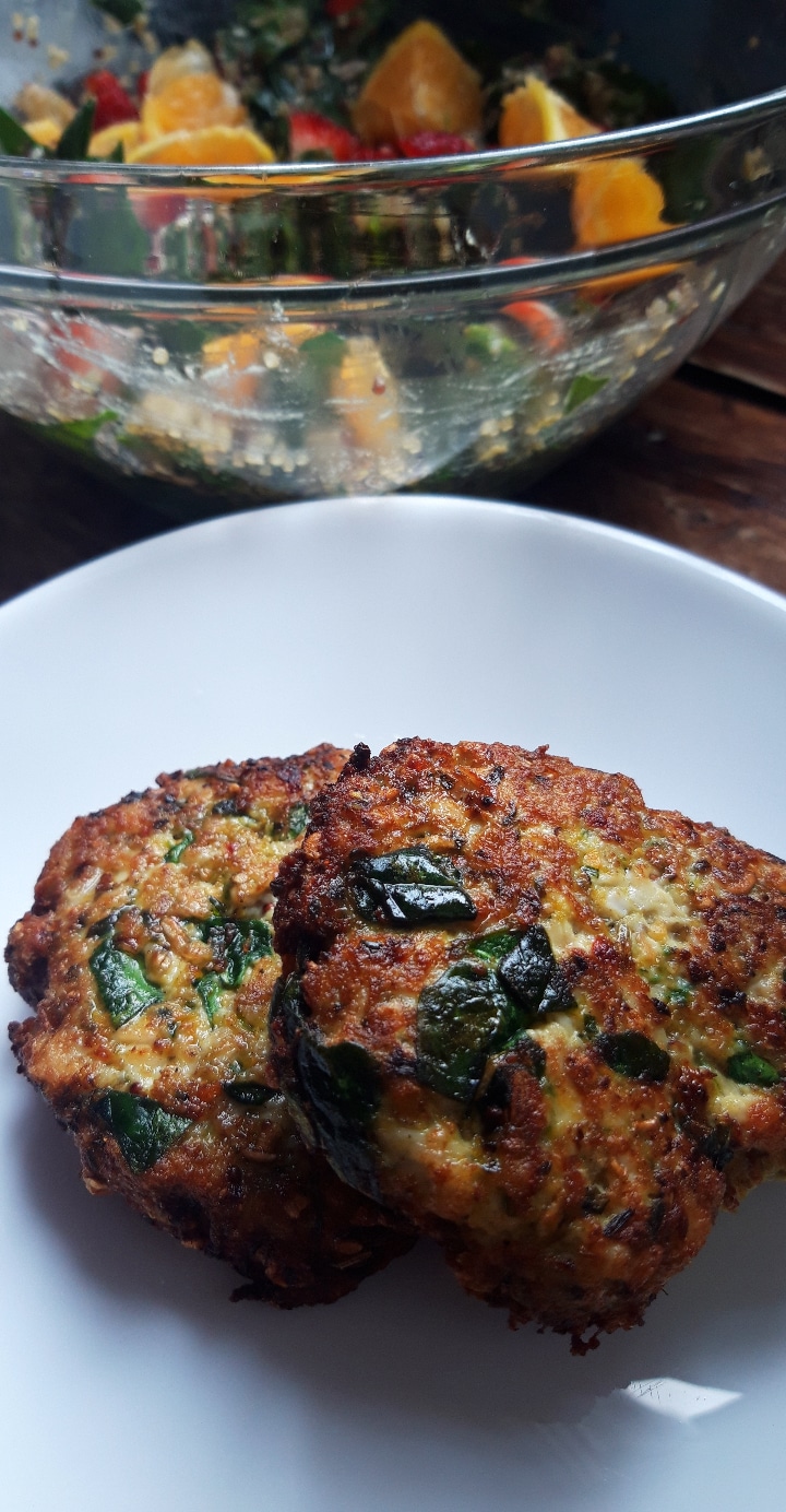 Ndërkohë që sallata që përgatita kishte: spinaq, quinoa të zier, 1 luleshtrydhe, 1 gjysmë portokall, pak fara miks (luledielli, kungulli, lini, susami). I hodha pak vaj ulliri, mustardë dhe pak lëng portokalli. Kombinimi me qoftet ishte perfekt