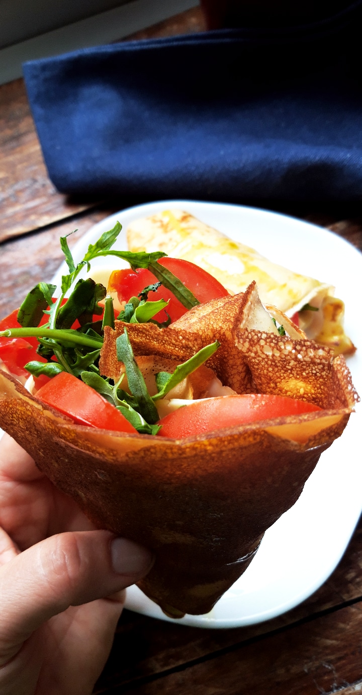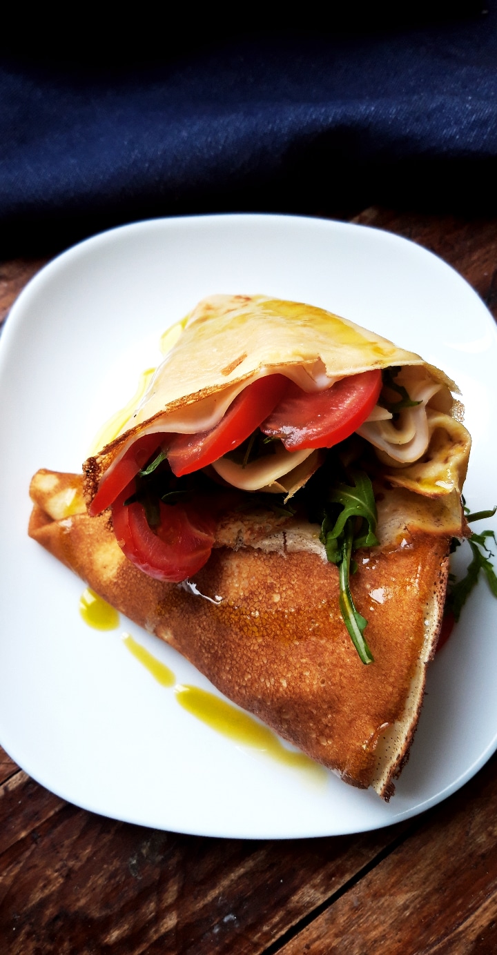 I miksova disa sekonda sa brumi u bë I njëtrajtshëm. I gatova në një tigan që nuk ngjit dhe secilën prej tyre I mbusha me djathë në feta, proshutë, pak rukola, disa feta domate. I hodha pak kripë e vaj ulliri dhe I palosa.